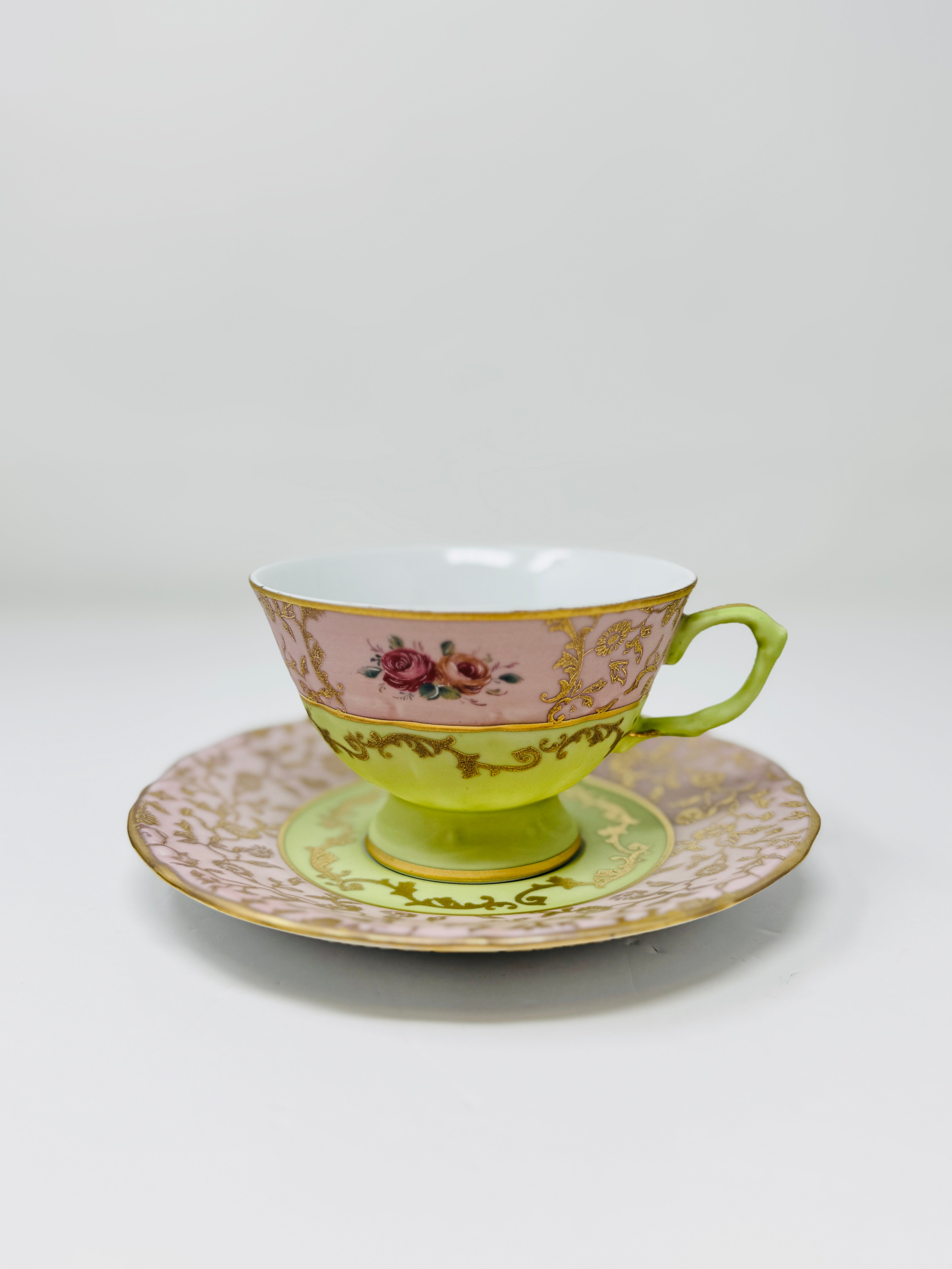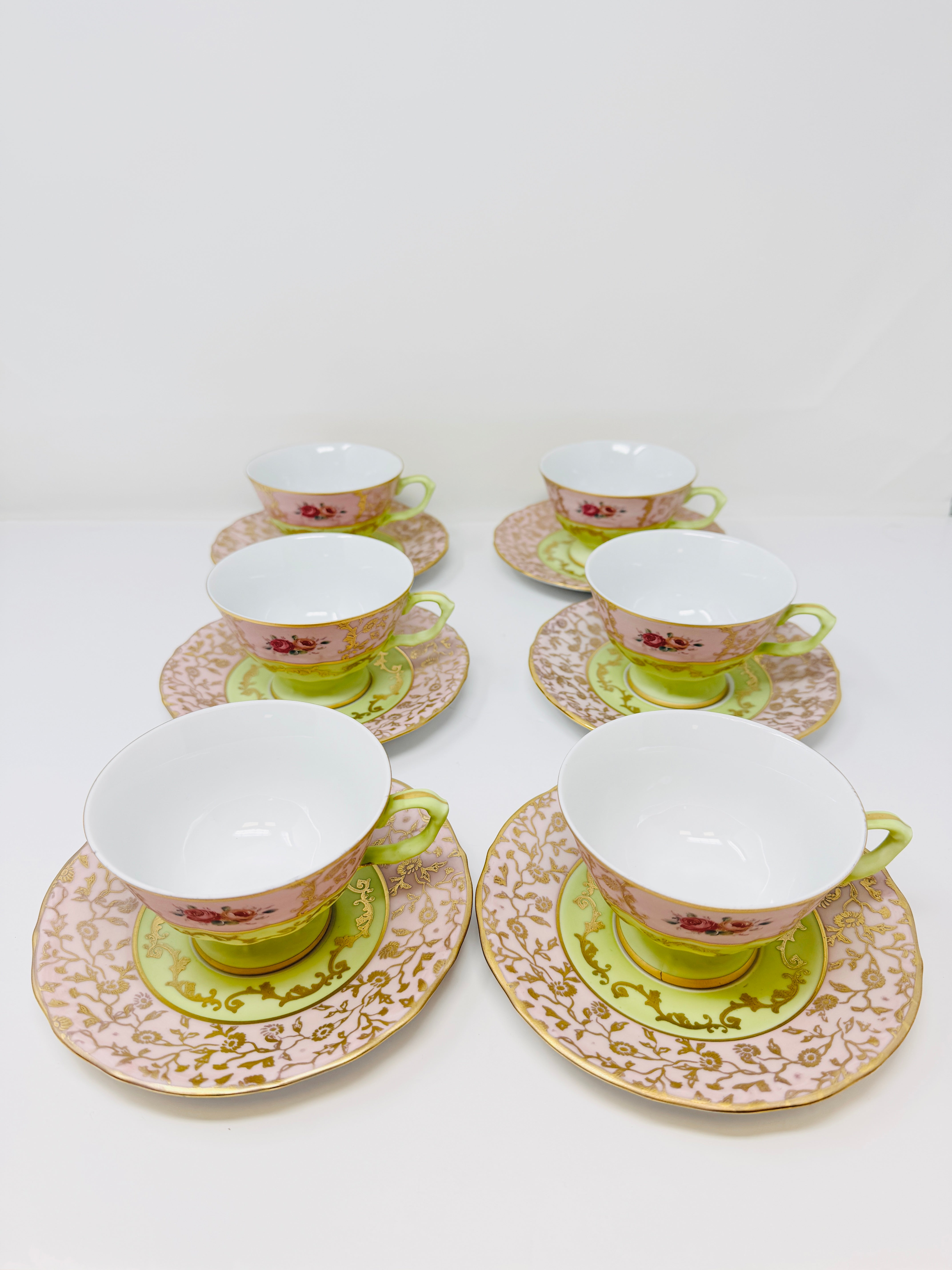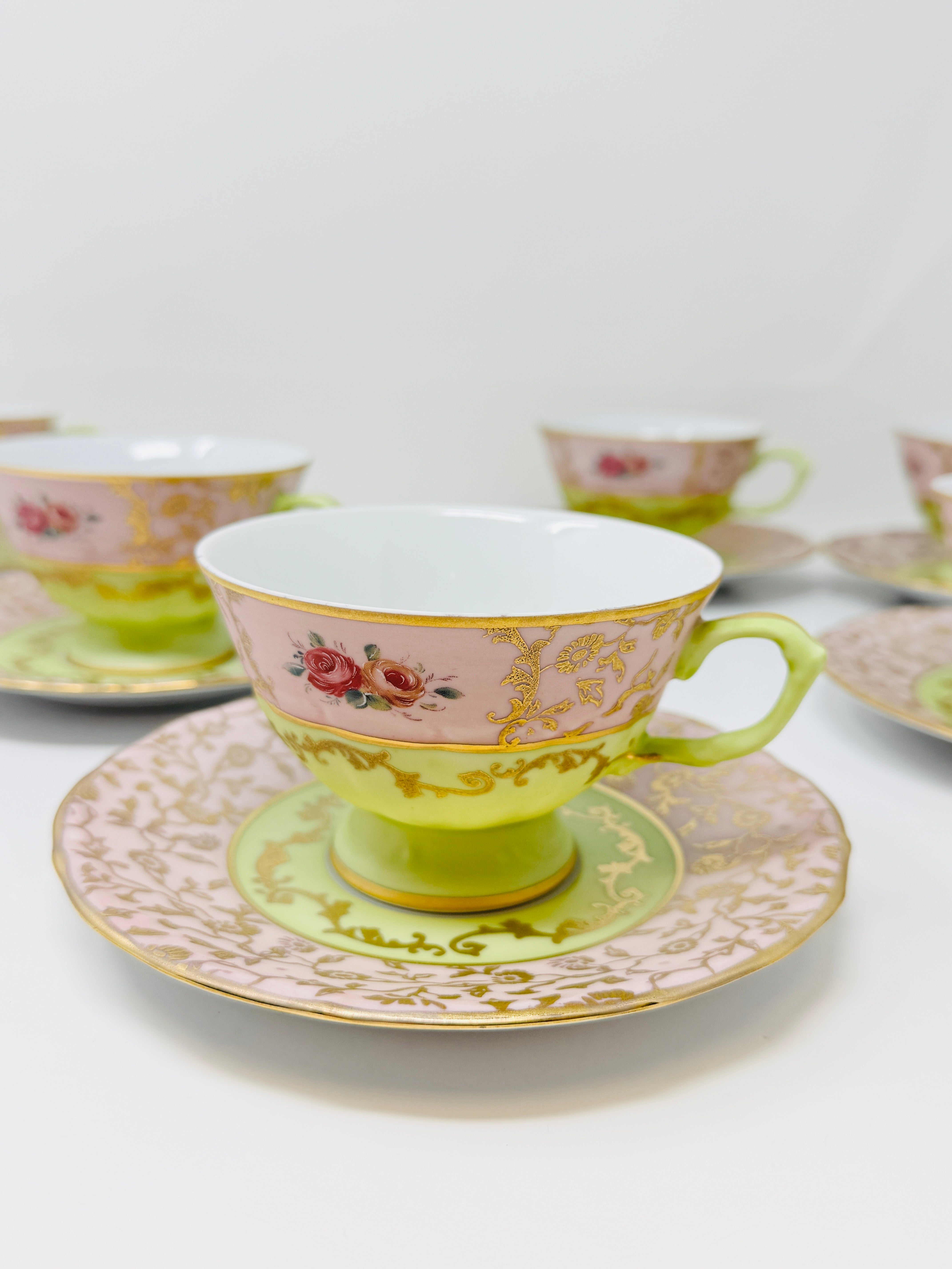 6 PERSON ITALIAN GREEN AND PINK TEA SET