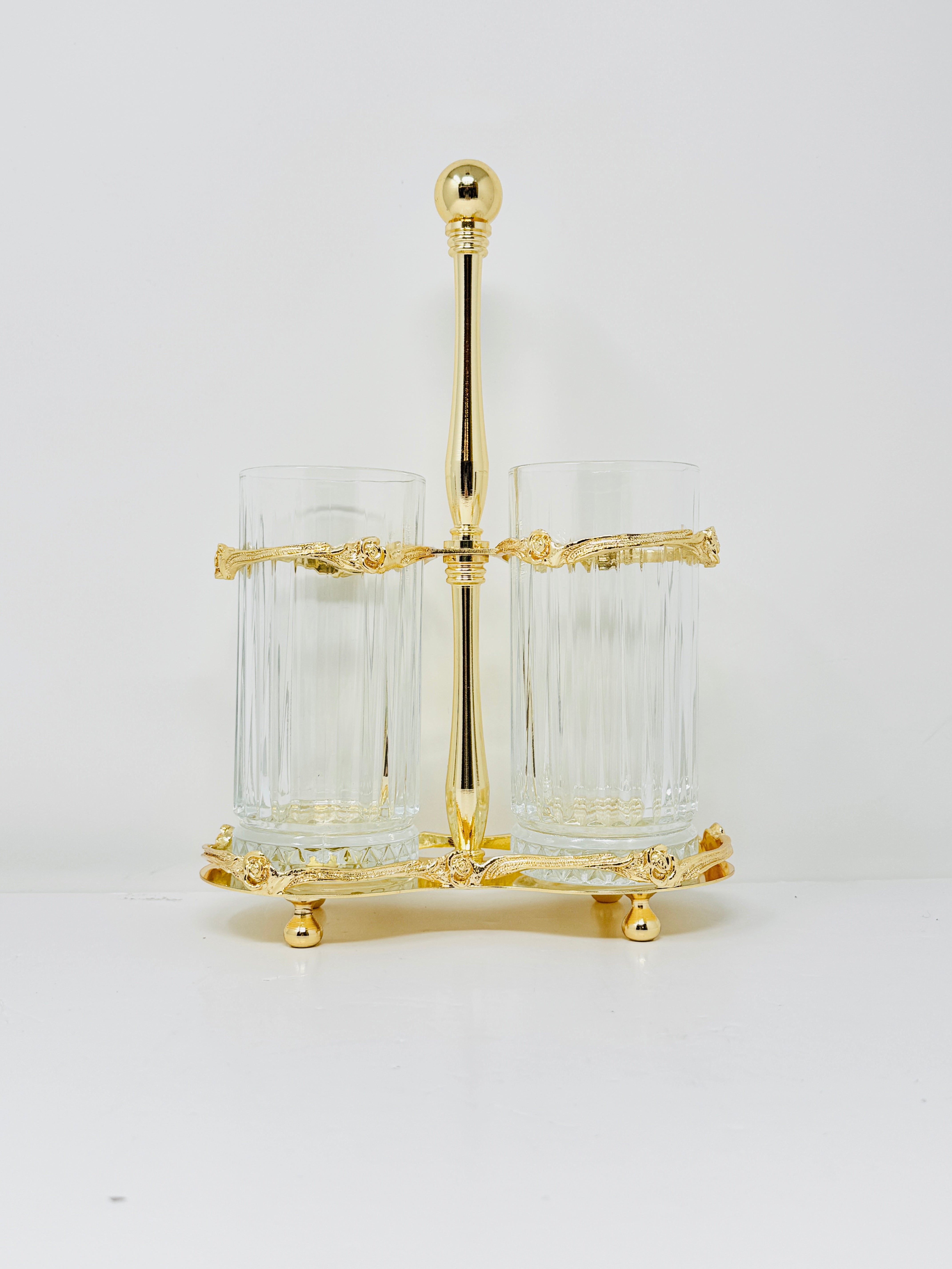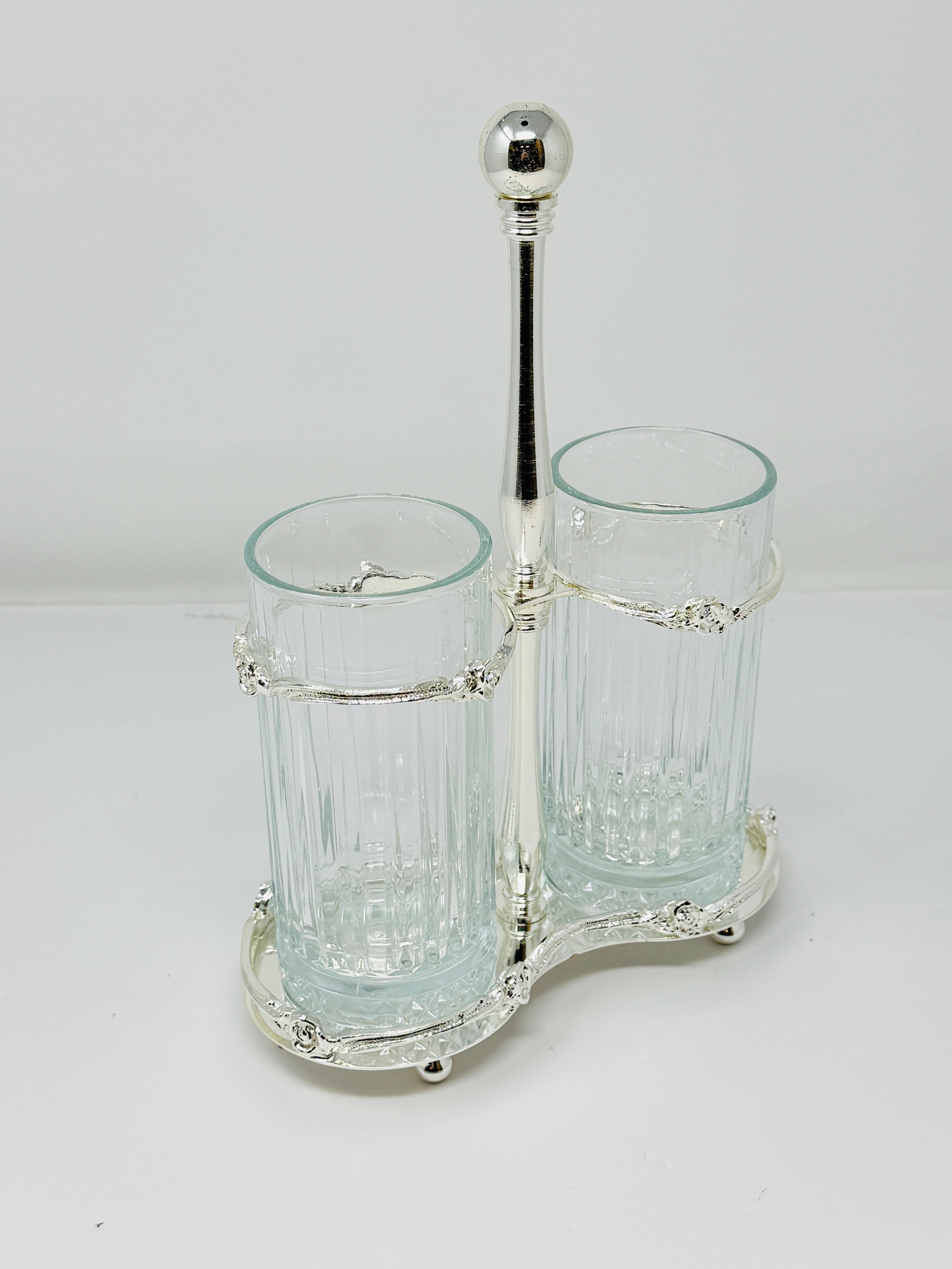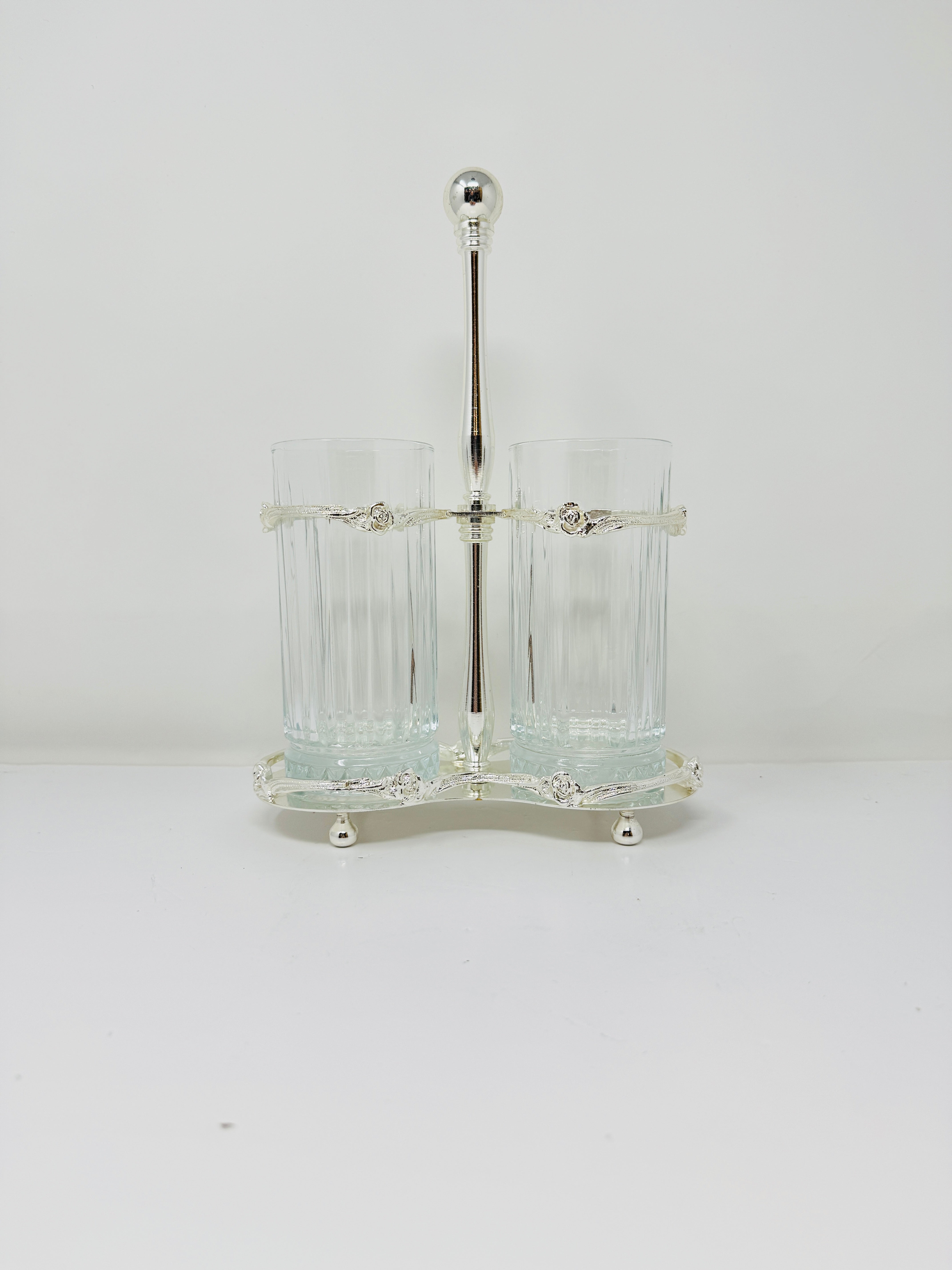 TWO-SECTION GLASS CUTLERY HOLDER ON STAND