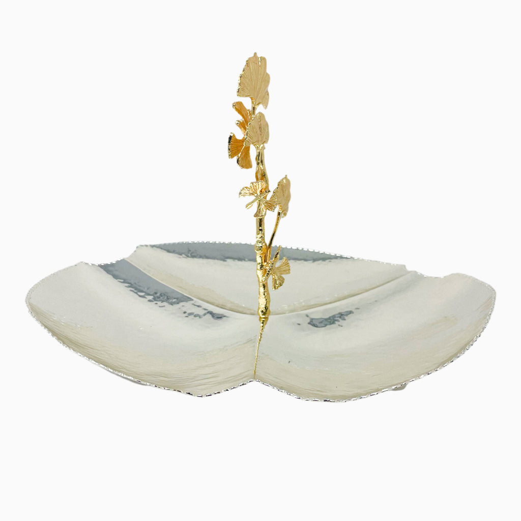 With its modern design, this three section snack bowl makes the perfect addition to any dinner party, ceremony or event. Accented with a gold-embellished butterfly handle, this piece is made to meet the needs of every guest. While some may prefer salty, others sweet or a combination of both, this three-section bowl provides enough space to leave all guests feeling full, happy and satisfied. This piece can also be used to decorate your kitchen counter, or serve as a key or jewelry holder.