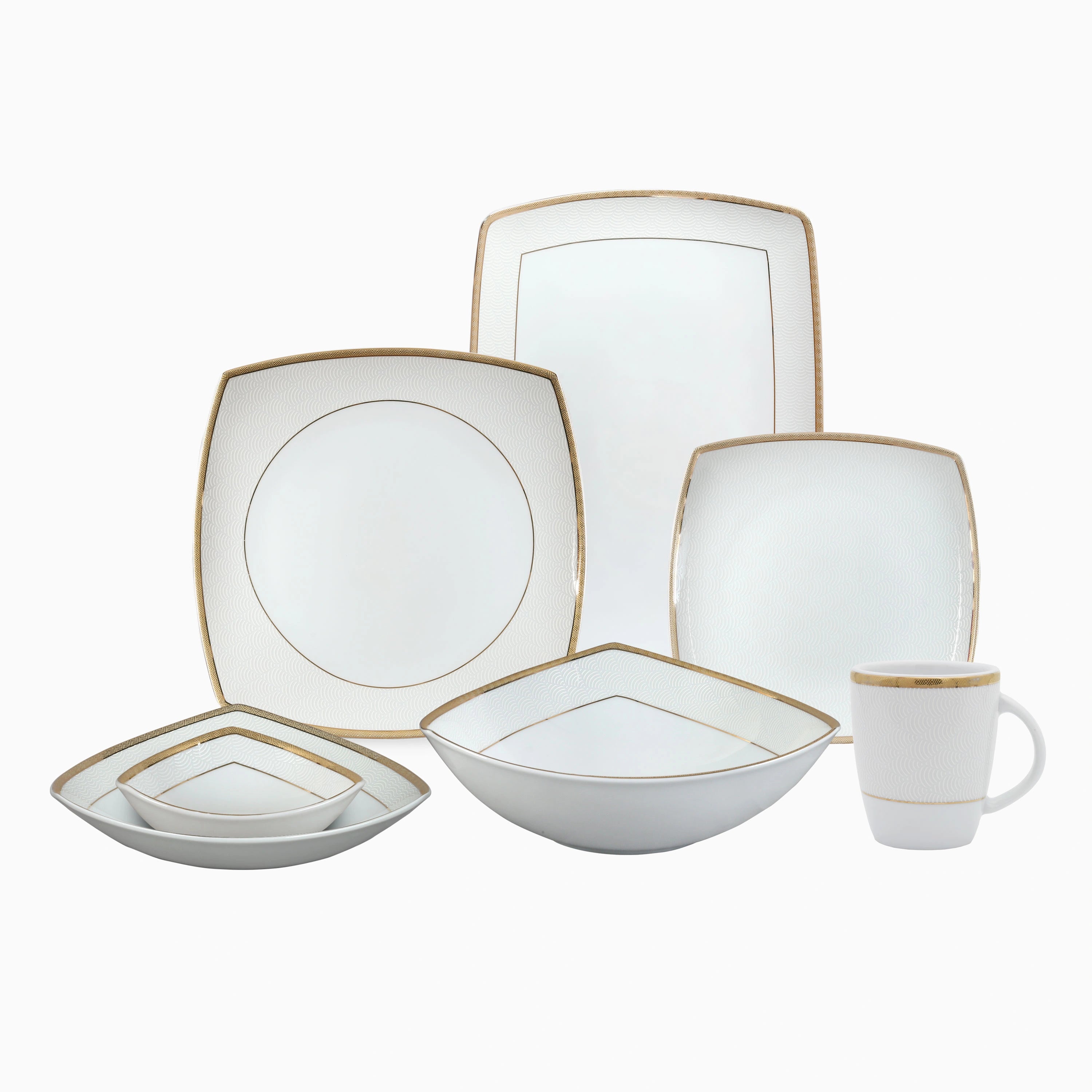Elevate your everyday dining and hosting experience with this complete 32-piece porcelain dinnerware set. Crafted from durable and high-quality porcelain, this collection features a classic yet modern design, combining a sleek white body with an elegant and eye-catching gold band along the rim. This set is ideal for both formal occasions and casual gatherings.
