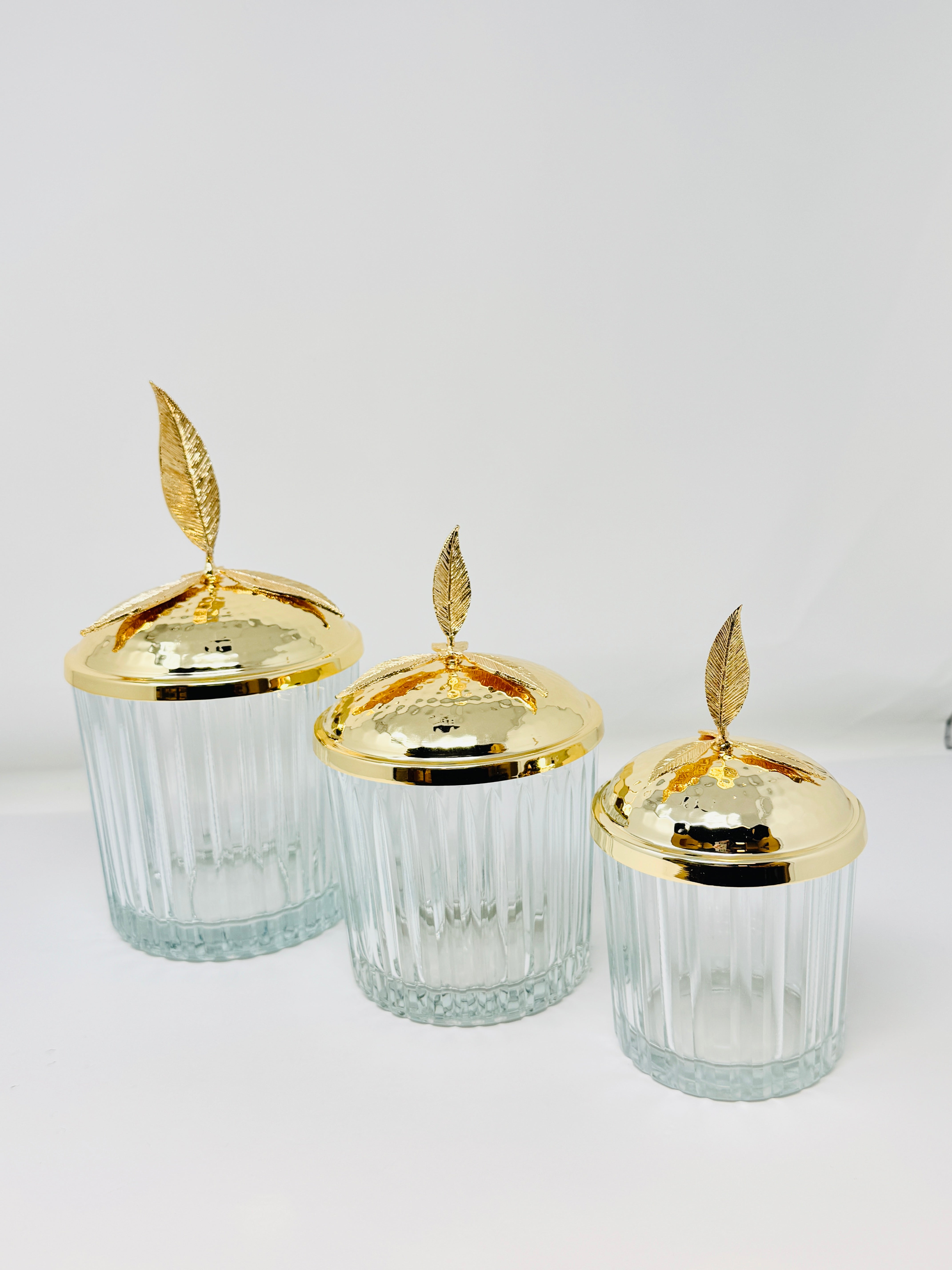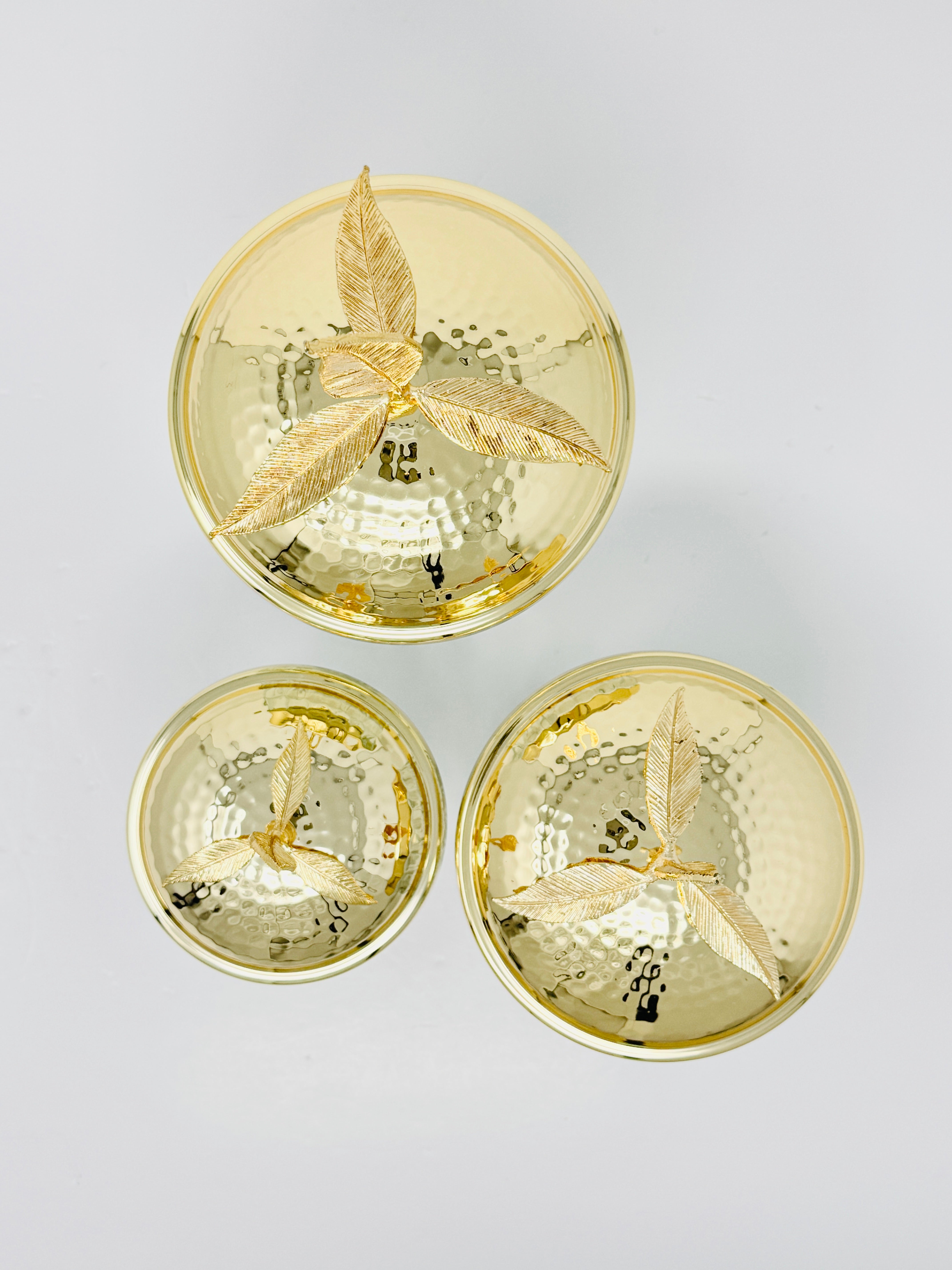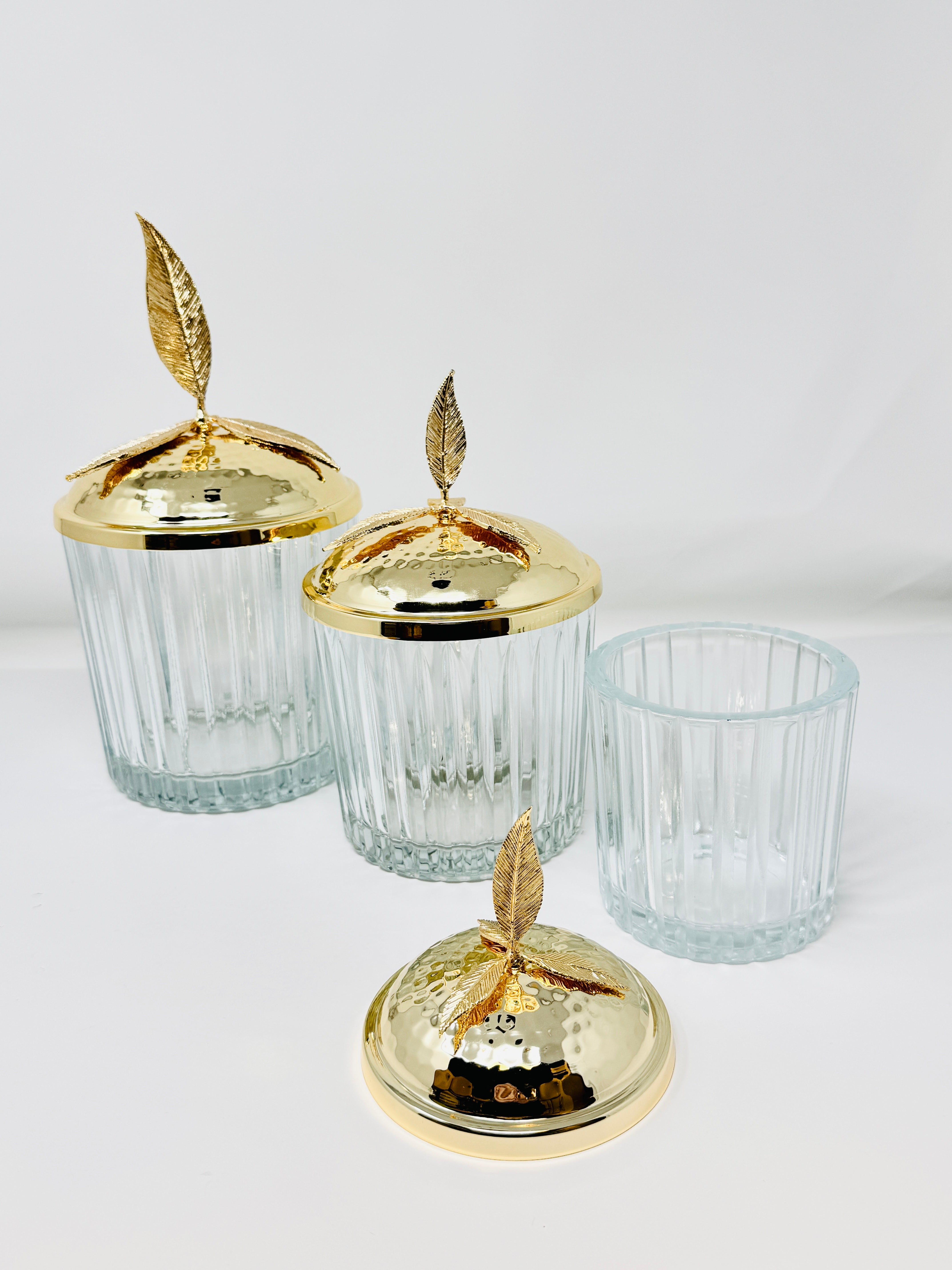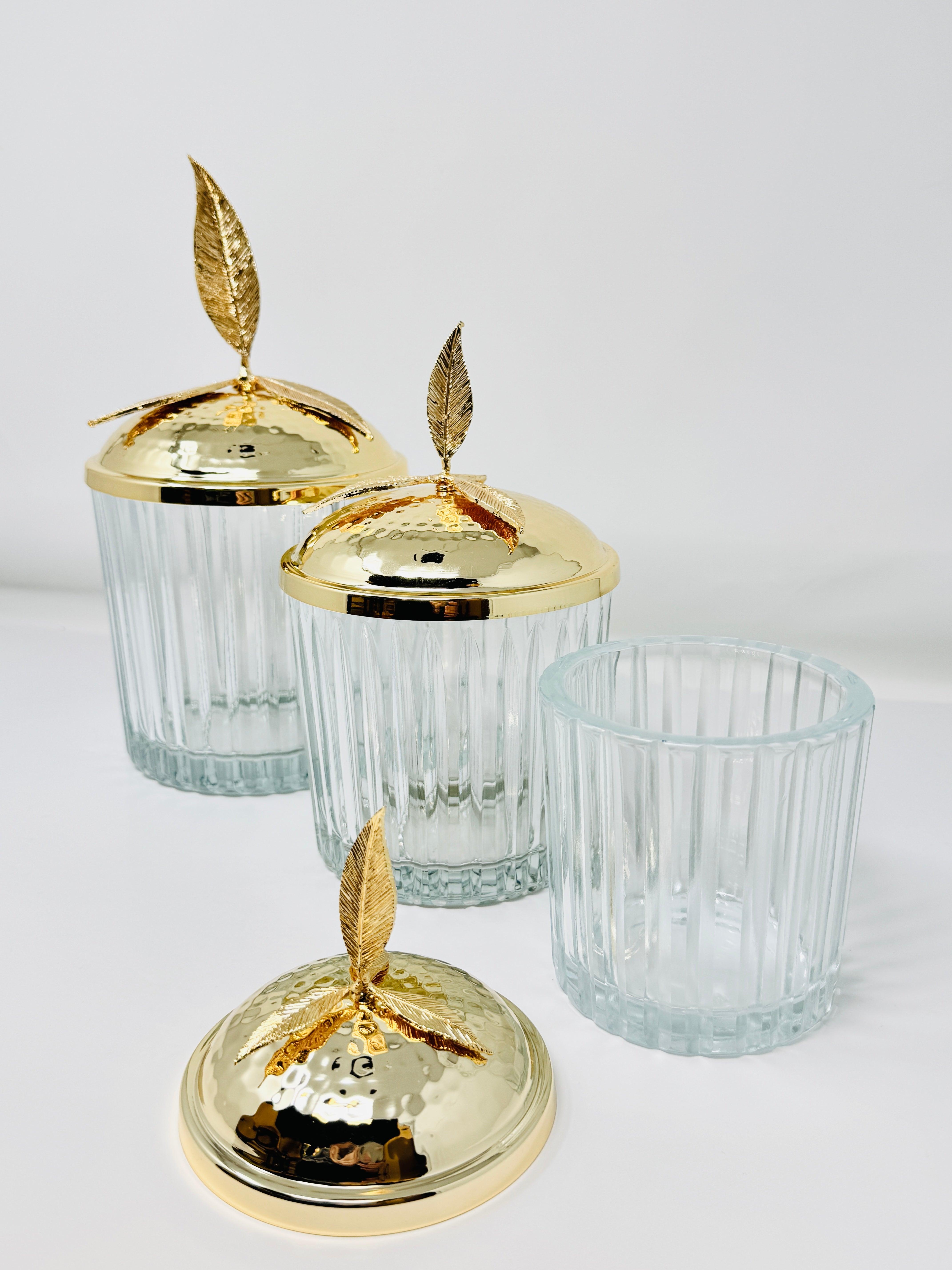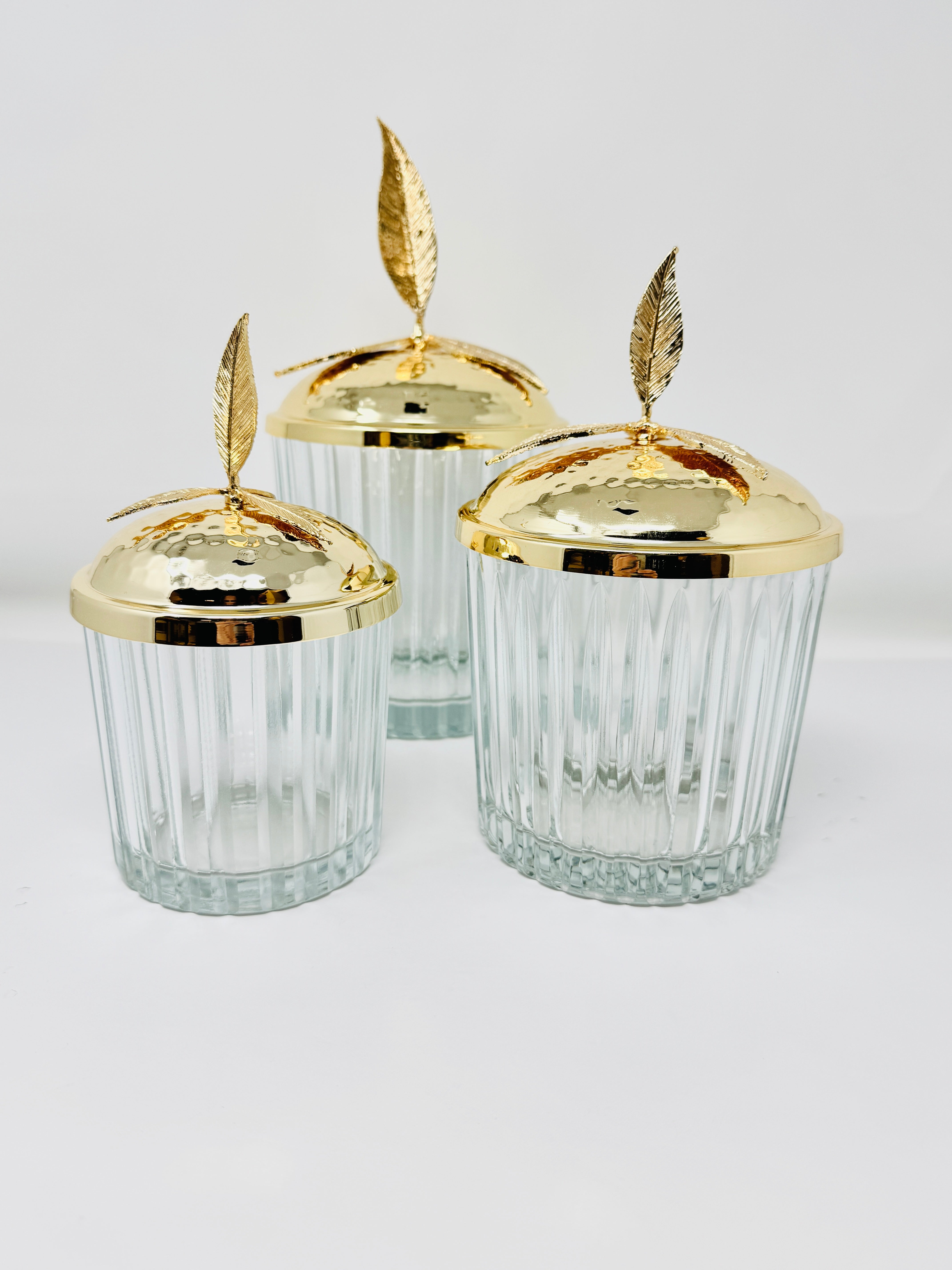GOLDEN TONE GLASS JAR SET WITH LID, LEAF COLLECTION