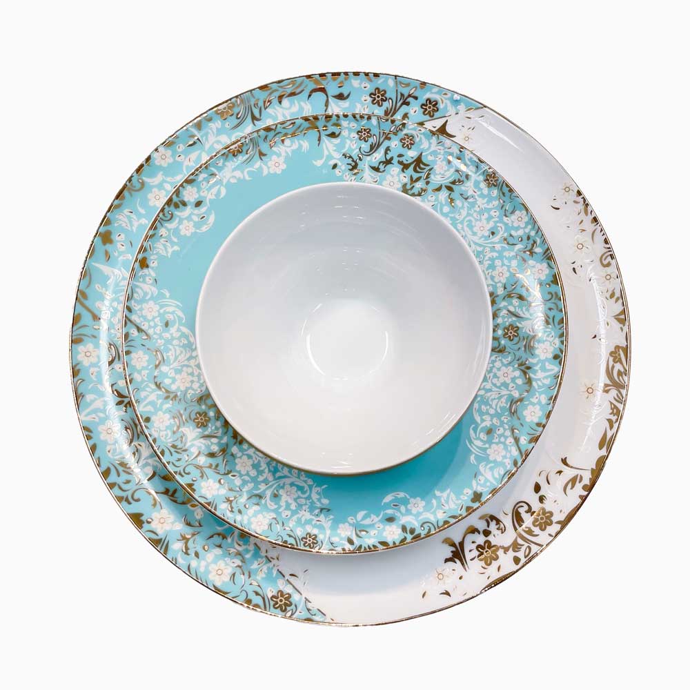 SIX PERSON 30-PIECE BLUE, WHITE, AND GOLD DINNERWARE SET