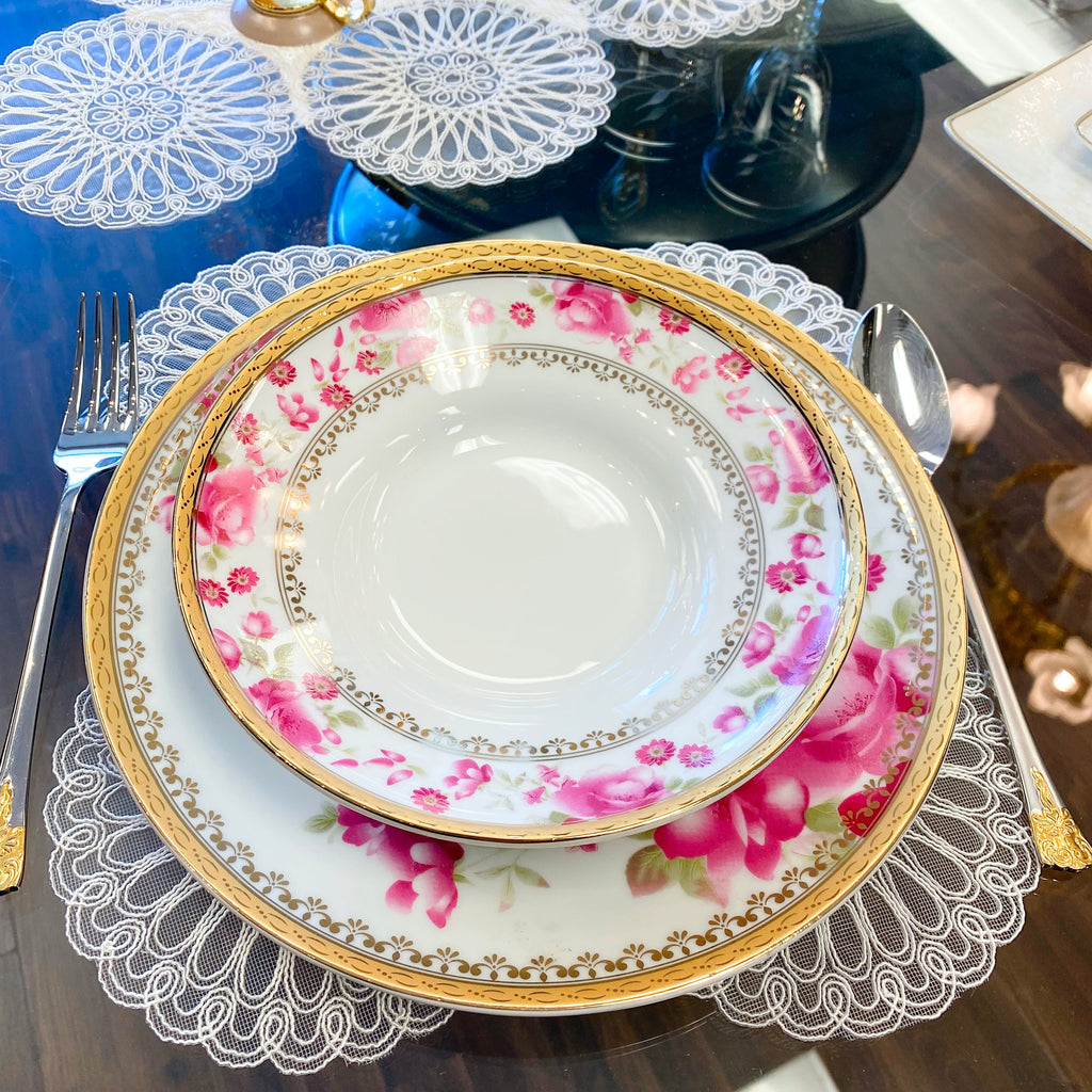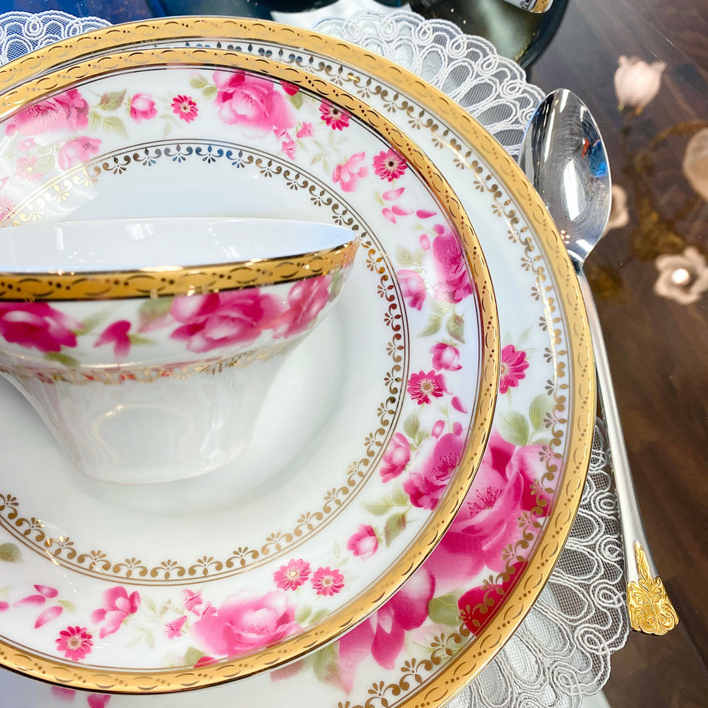 This charming 30-piece dinnerware set adds a touch of elegance to any dining occasion. Crafted from high-quality porcelain, this set features a delightful pink floral pattern accented with a delicate gold rim, creating a cheerful and sophisticated look. Whether you're hosting a casual gathering or a formal dinner party, this set will elevate your dining experience.