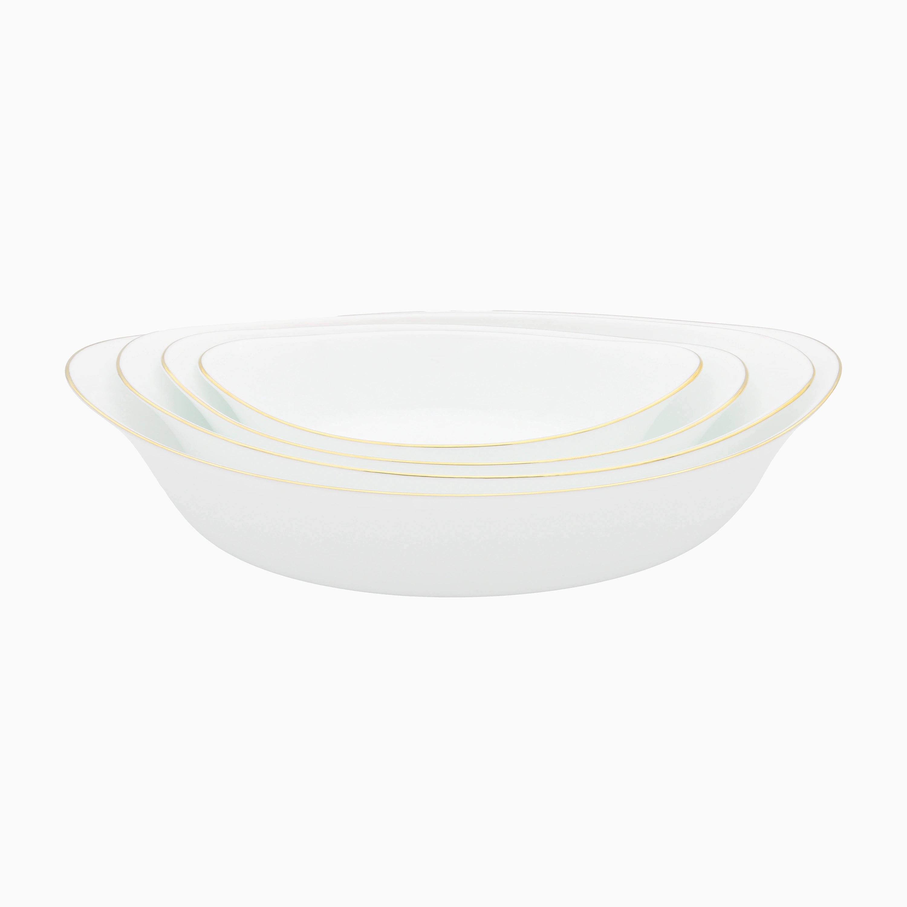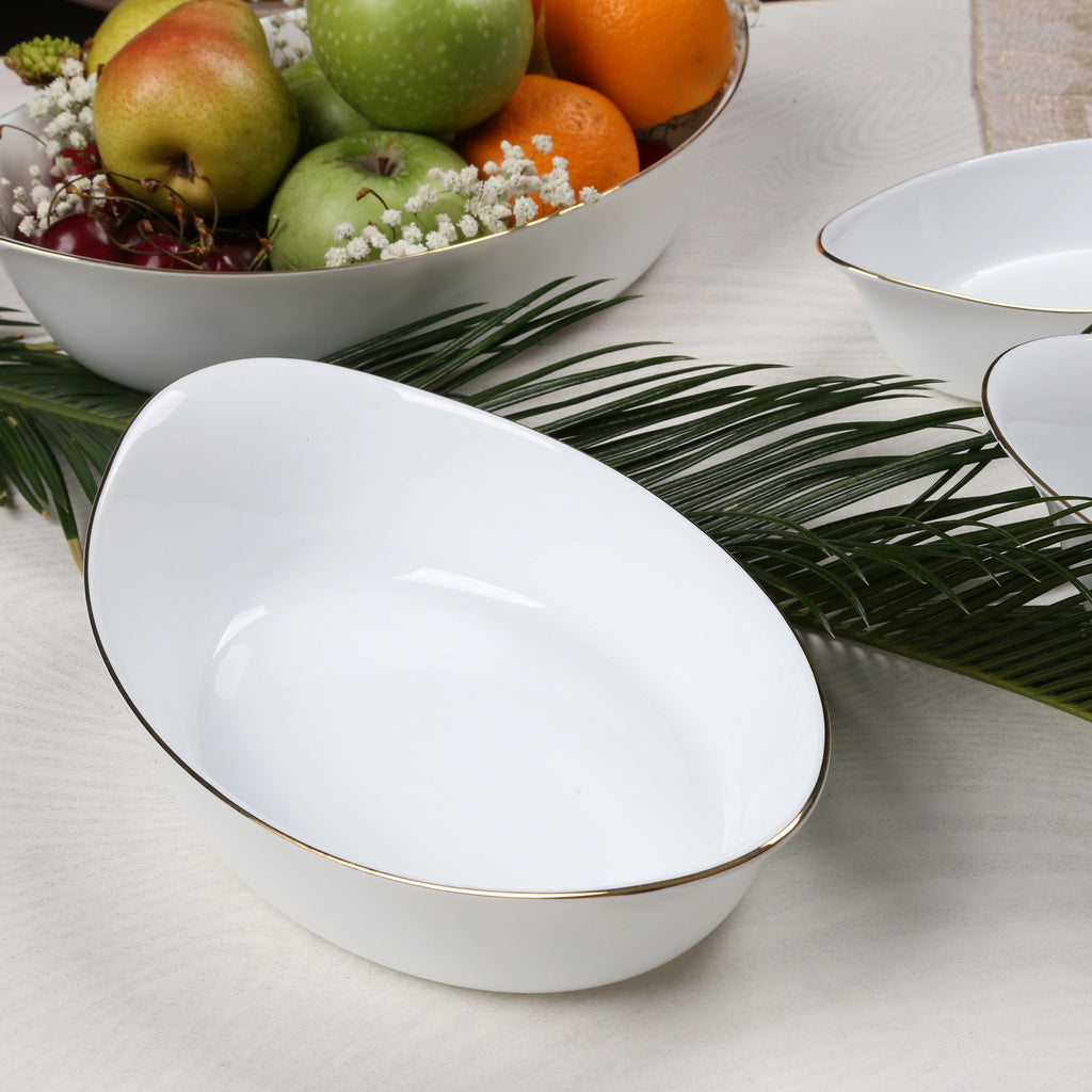 Bring a touch of modern luxury to your home with the Barco 4-Piece Oval Bowl Set. This collection combines clean, contemporary design with a hint of classic elegance, making it a perfect addition to any Canadian home. Crafted from smooth, high-quality opal glass and finished with a refined gold rim, these bowls offer a versatile and sophisticated way to serve.