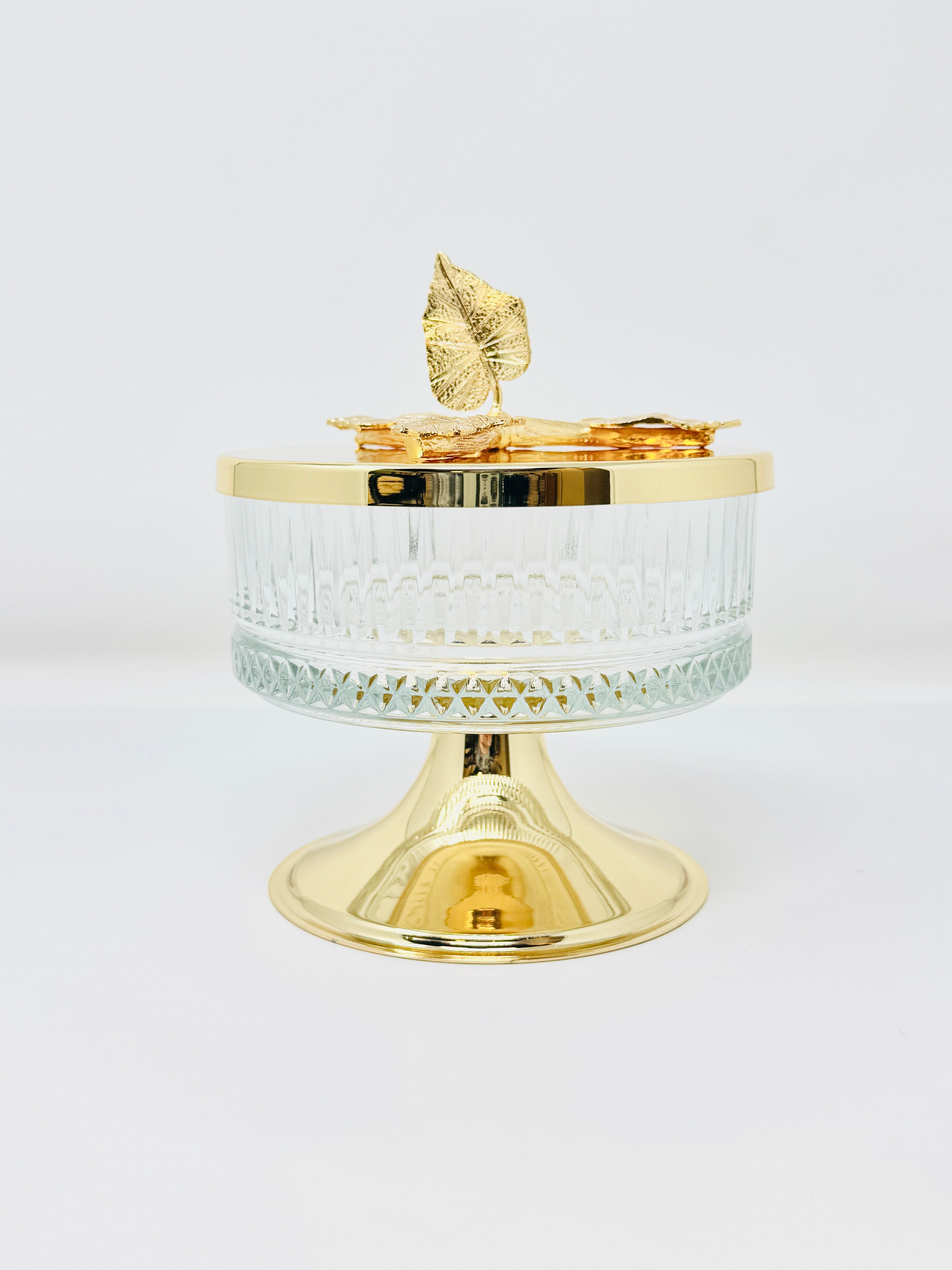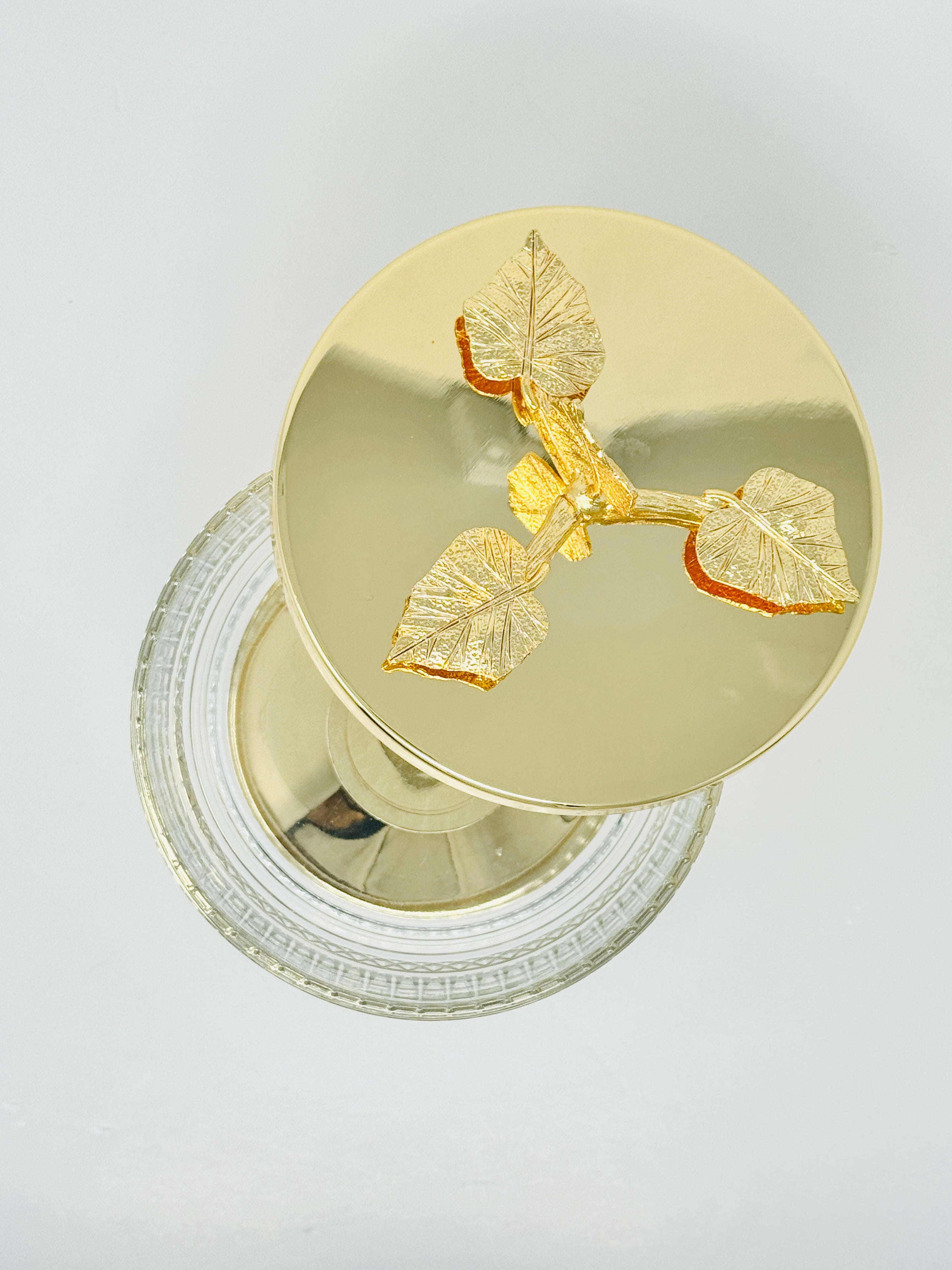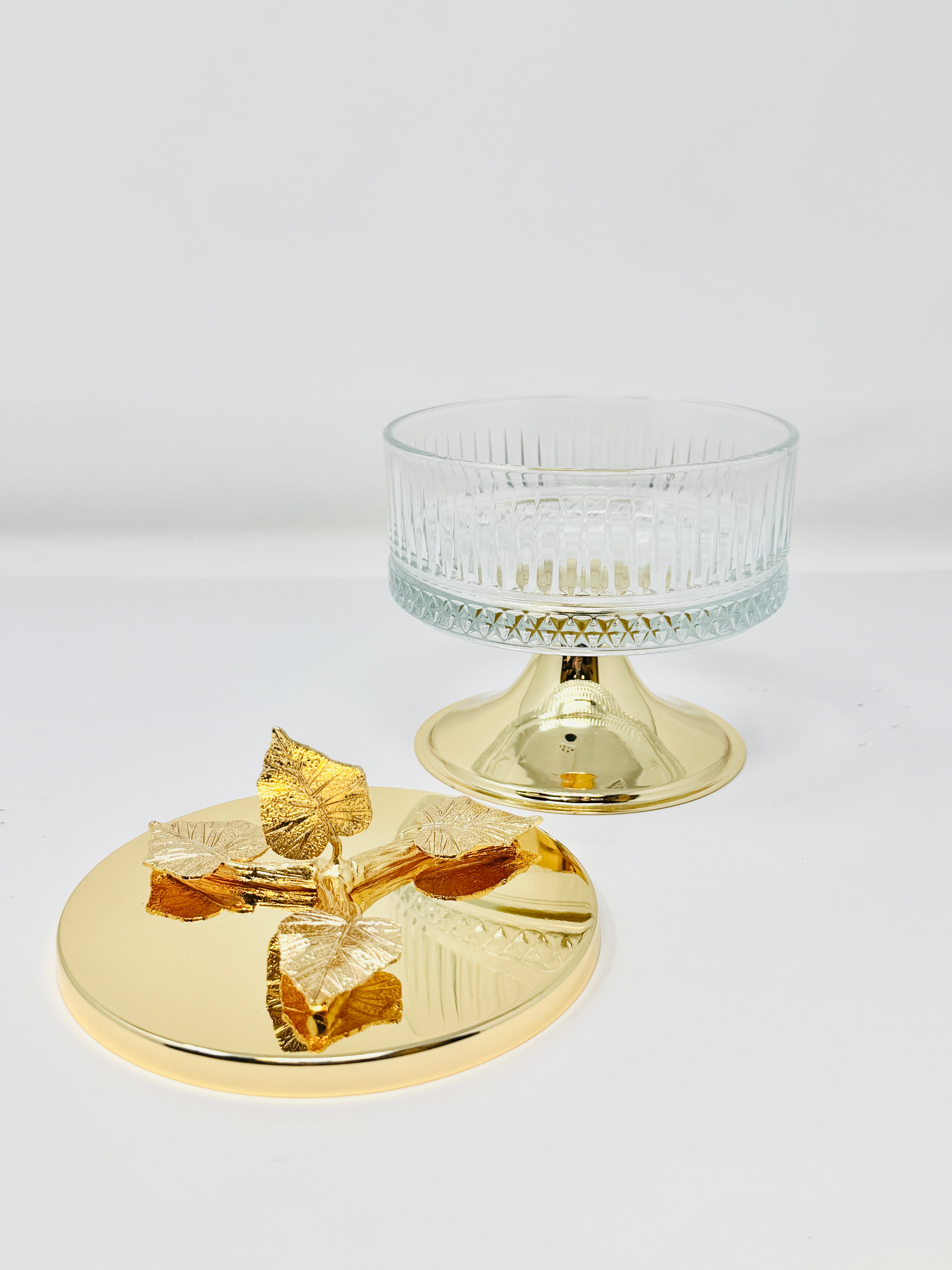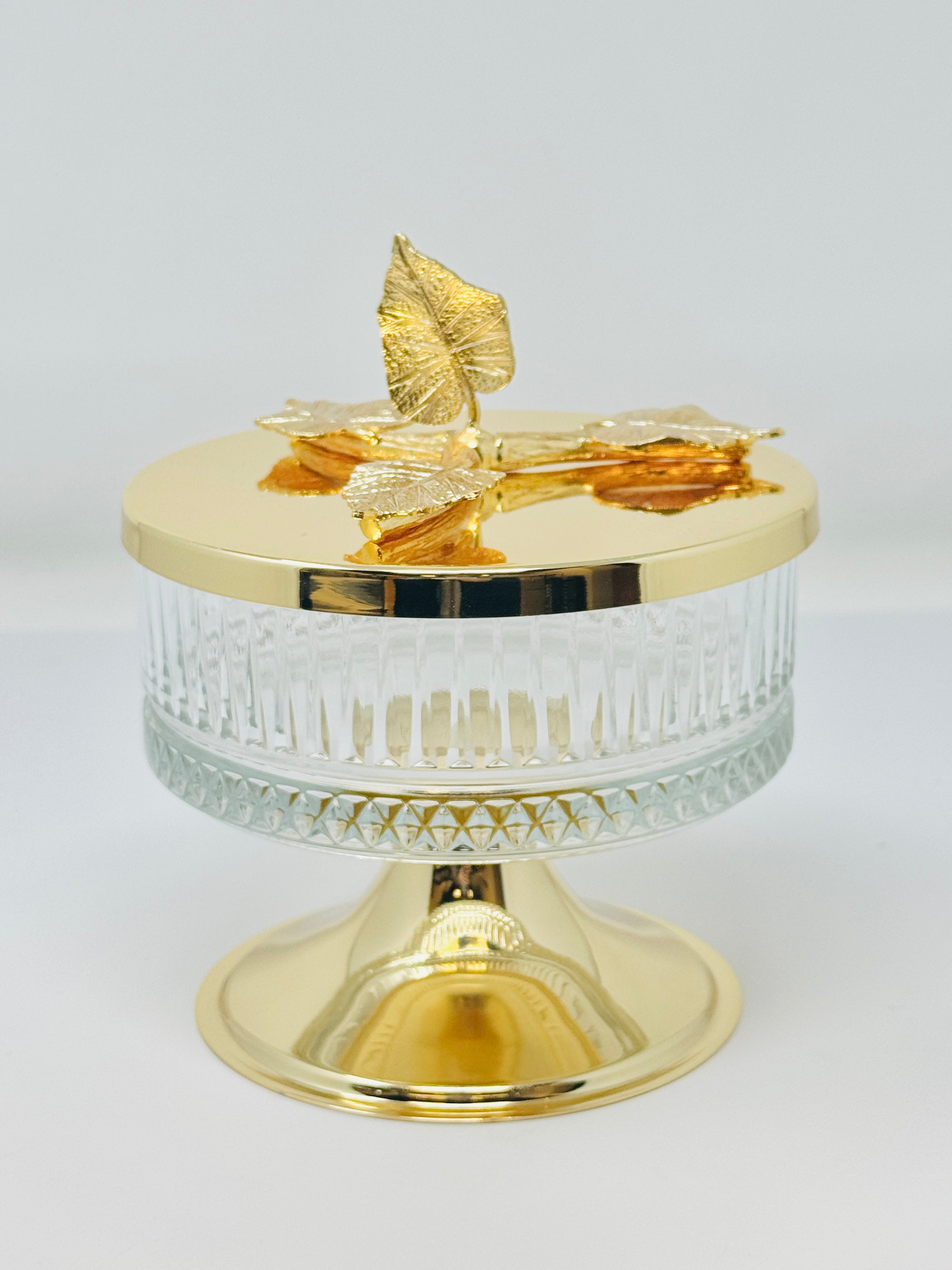 This beautifully crafted Glass Bowl with Golden Tone Leaf Lid is a perfect way to serve sweets and snacks. This piece is also a great addition to any kitchen counter or dining room table. Fill it with fruit or potpourri for an elegant look.