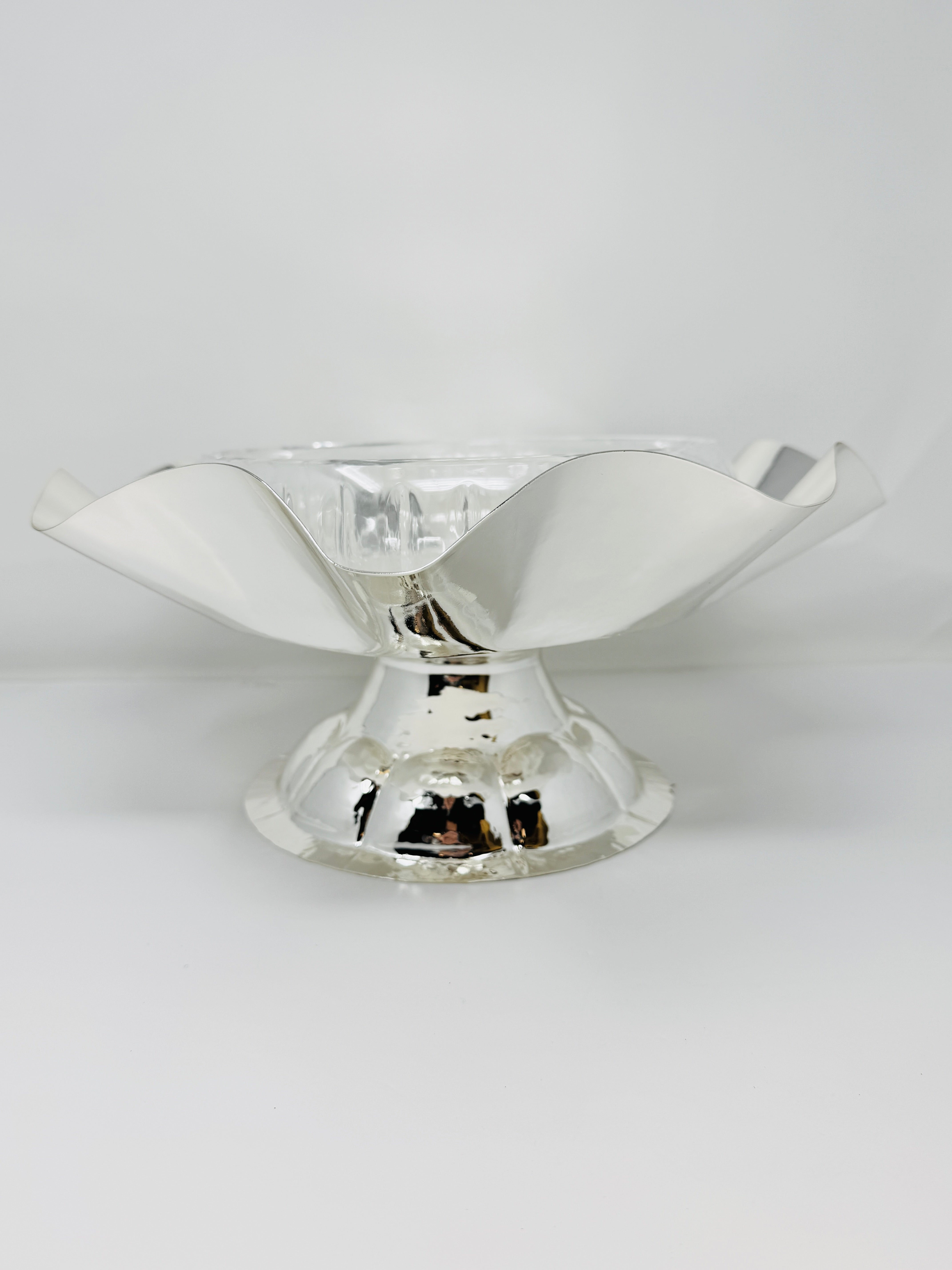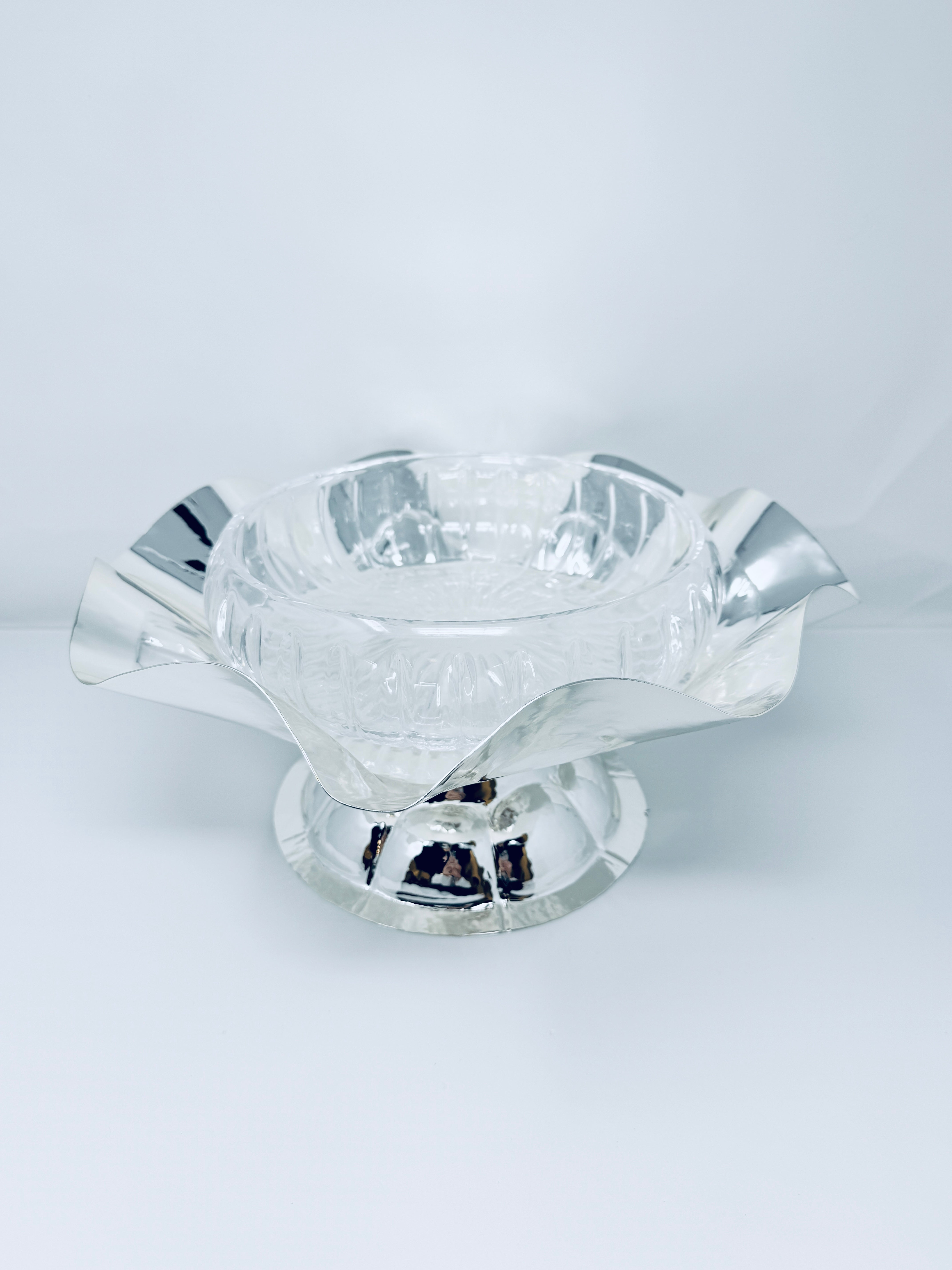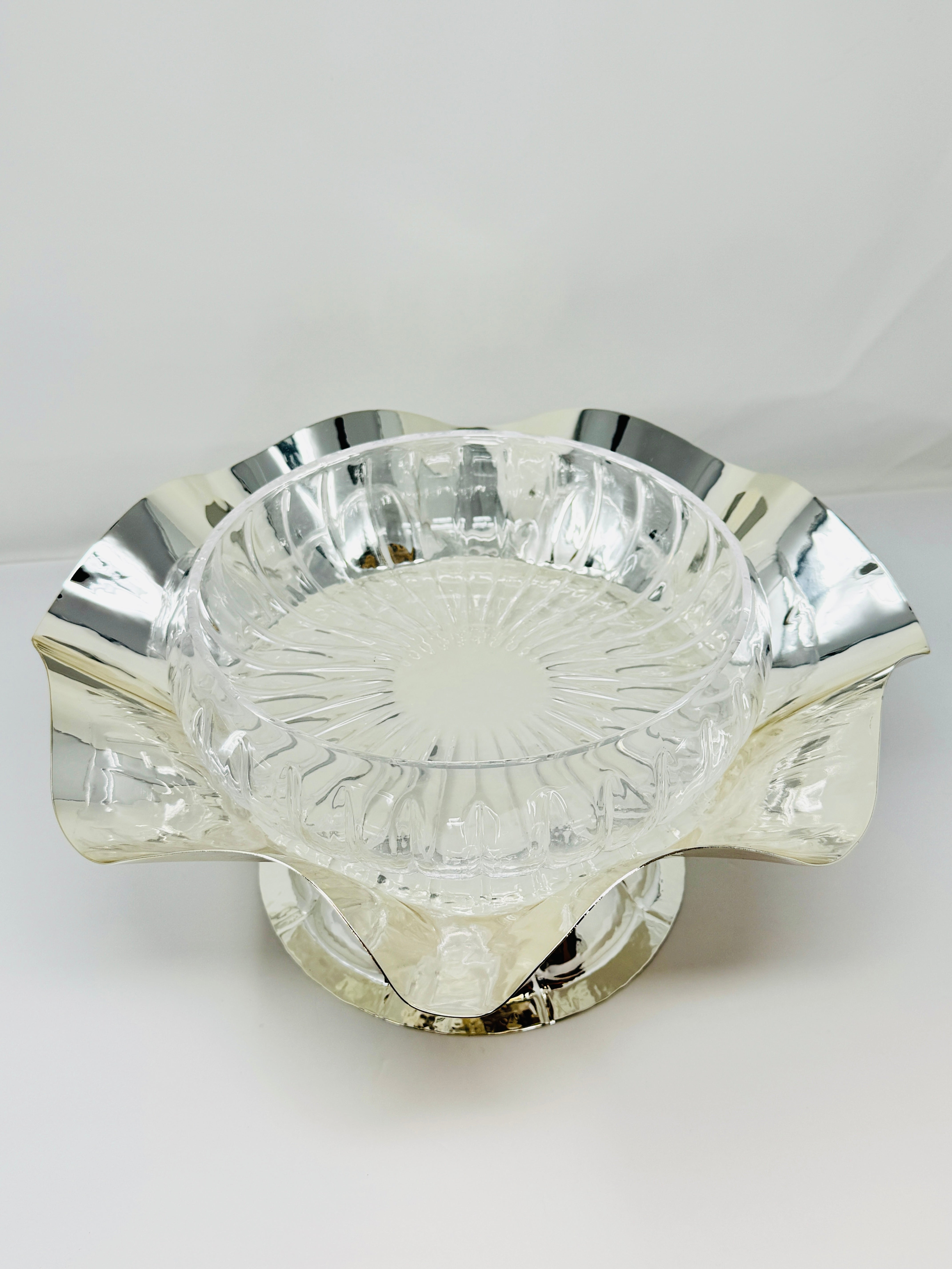 GLASS FRUIT BOWL ON SILVER TONE STAND