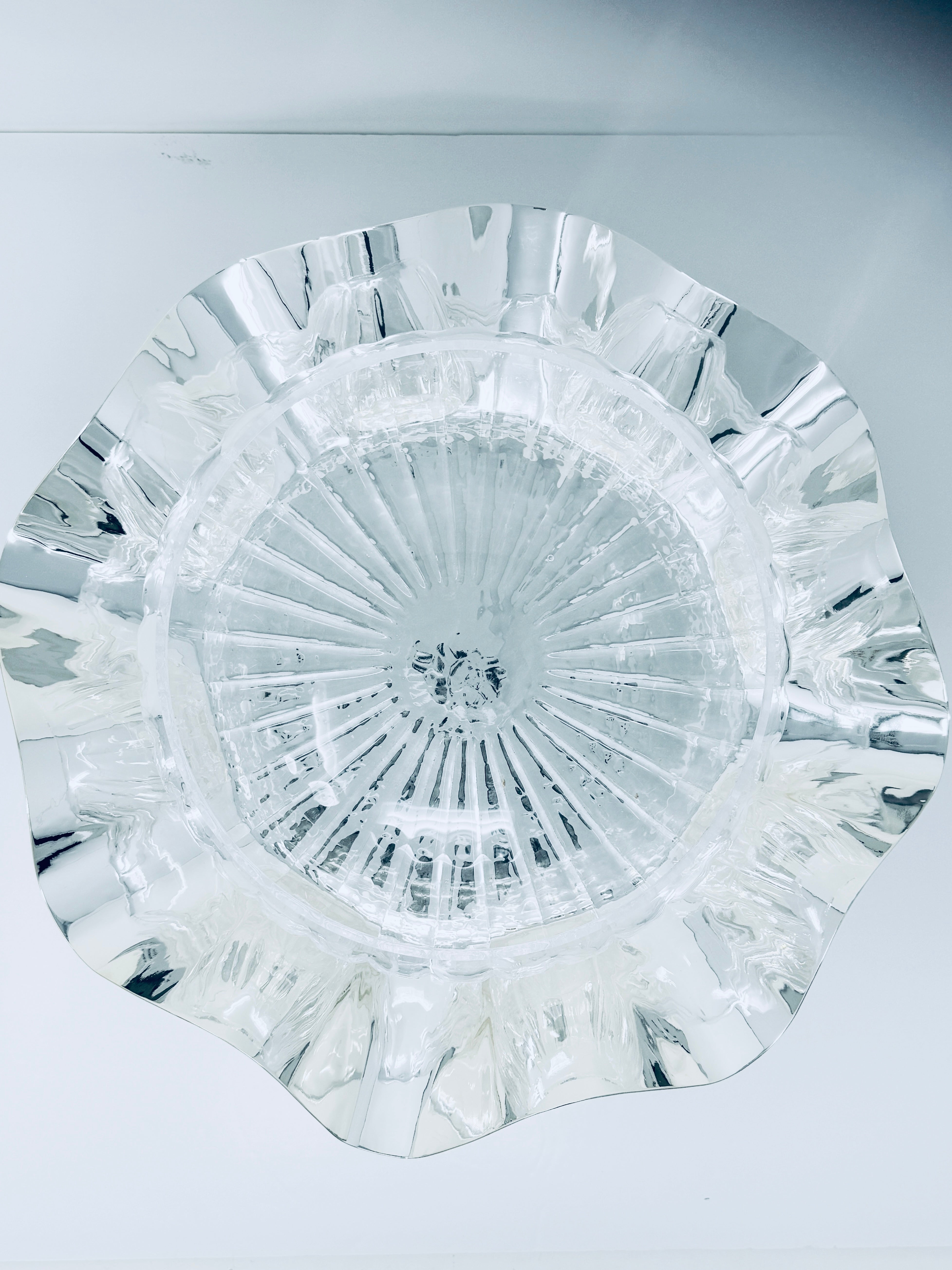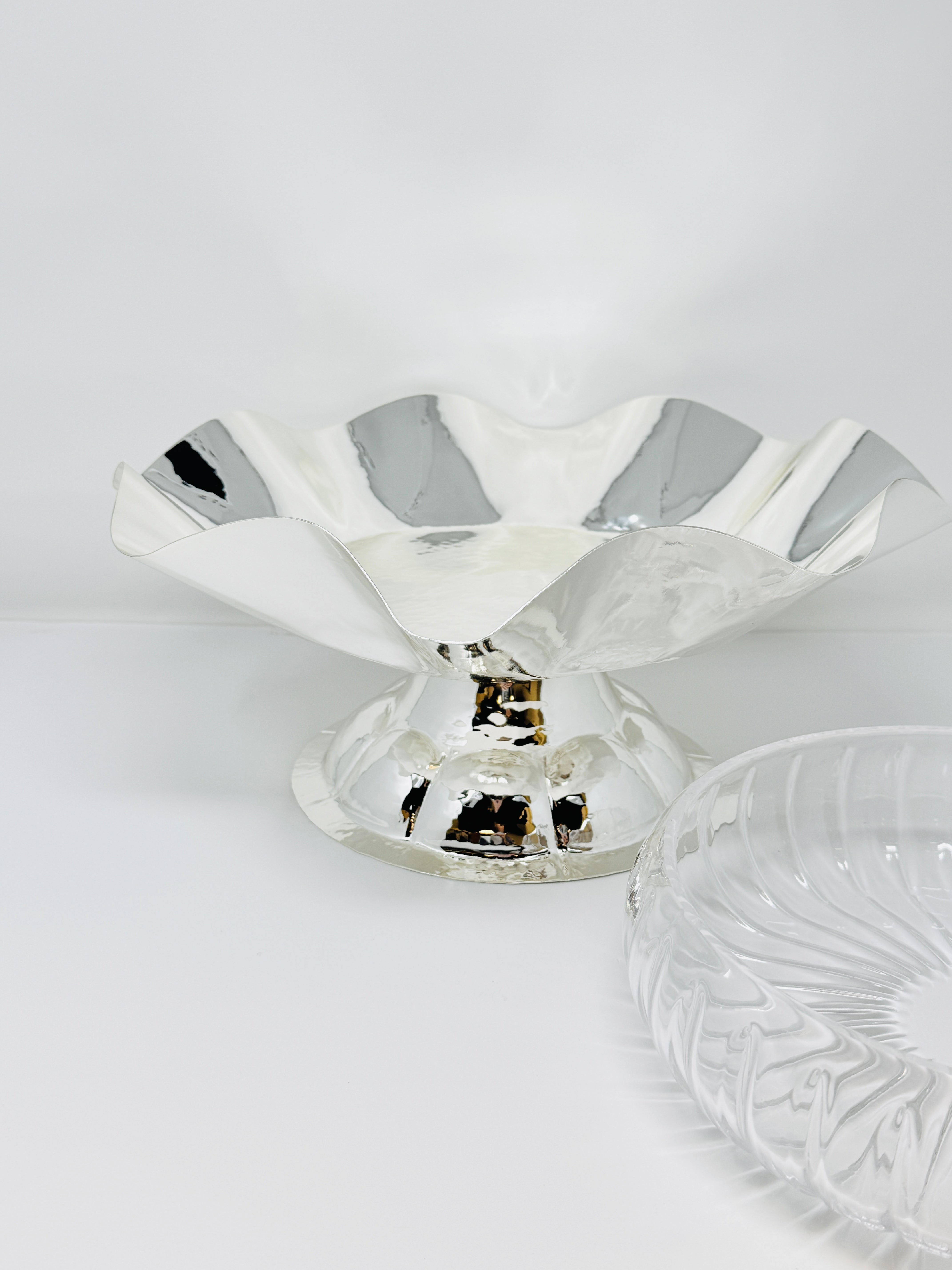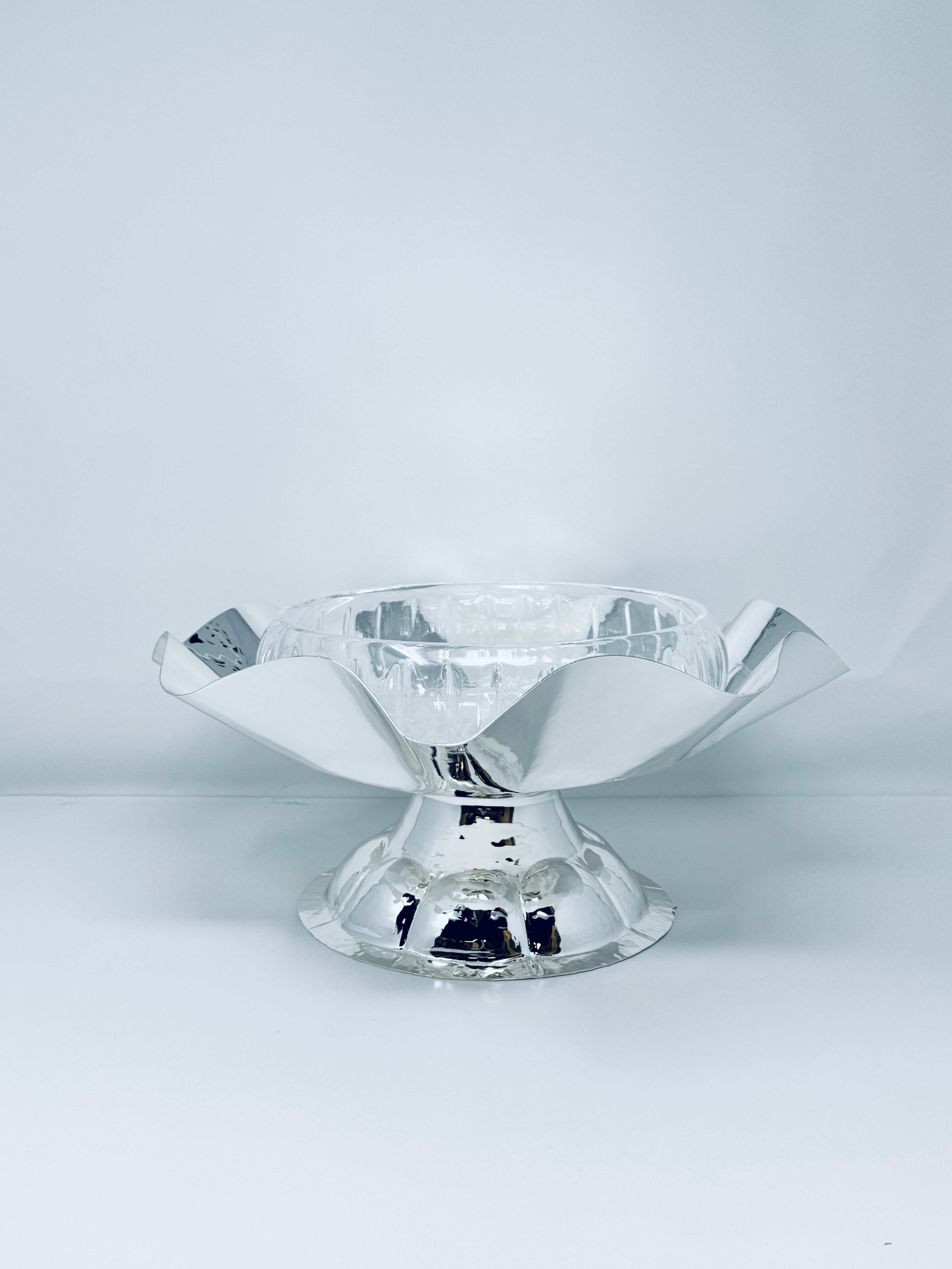 GLASS FRUIT BOWL ON SILVER TONE STAND