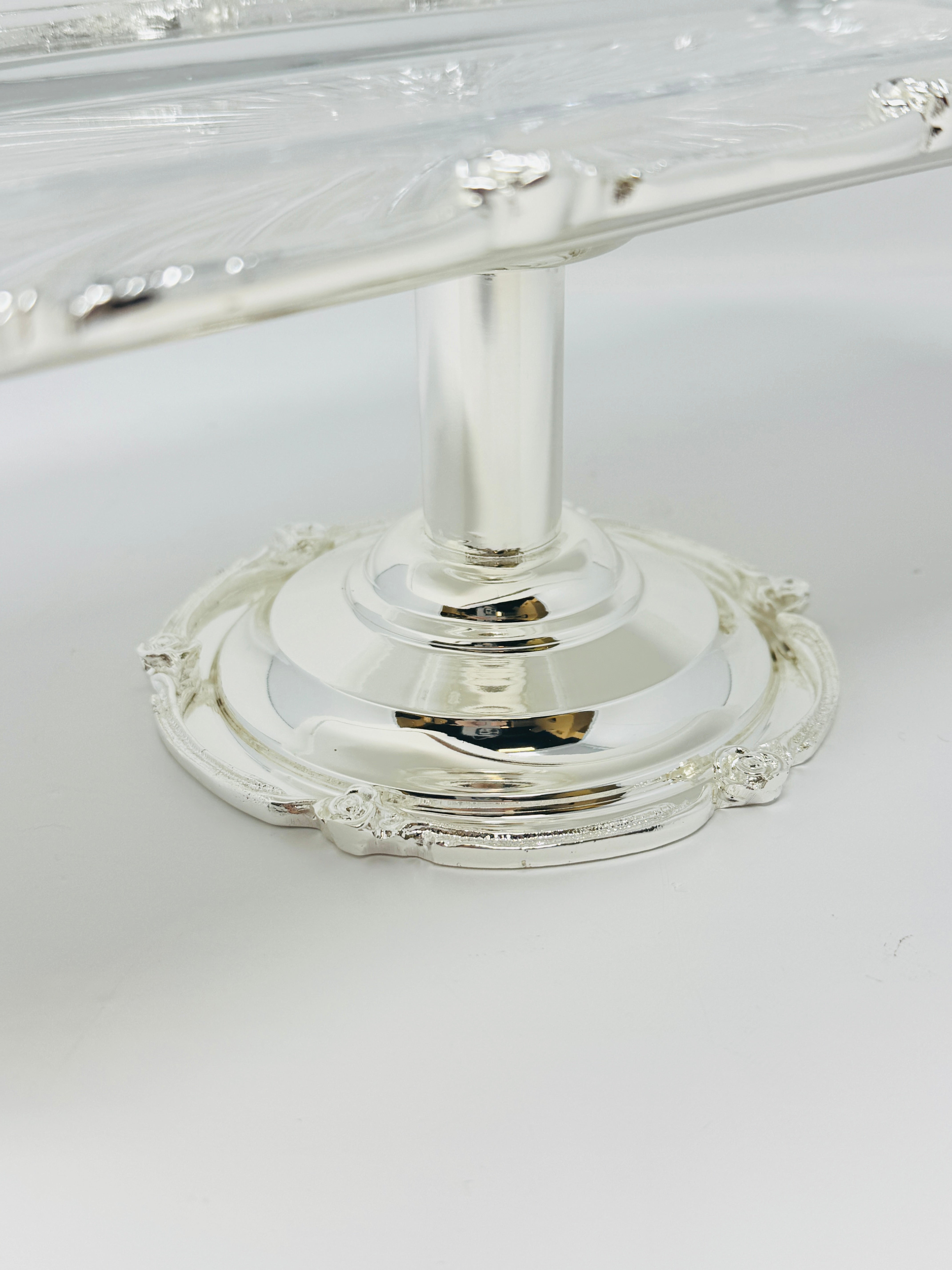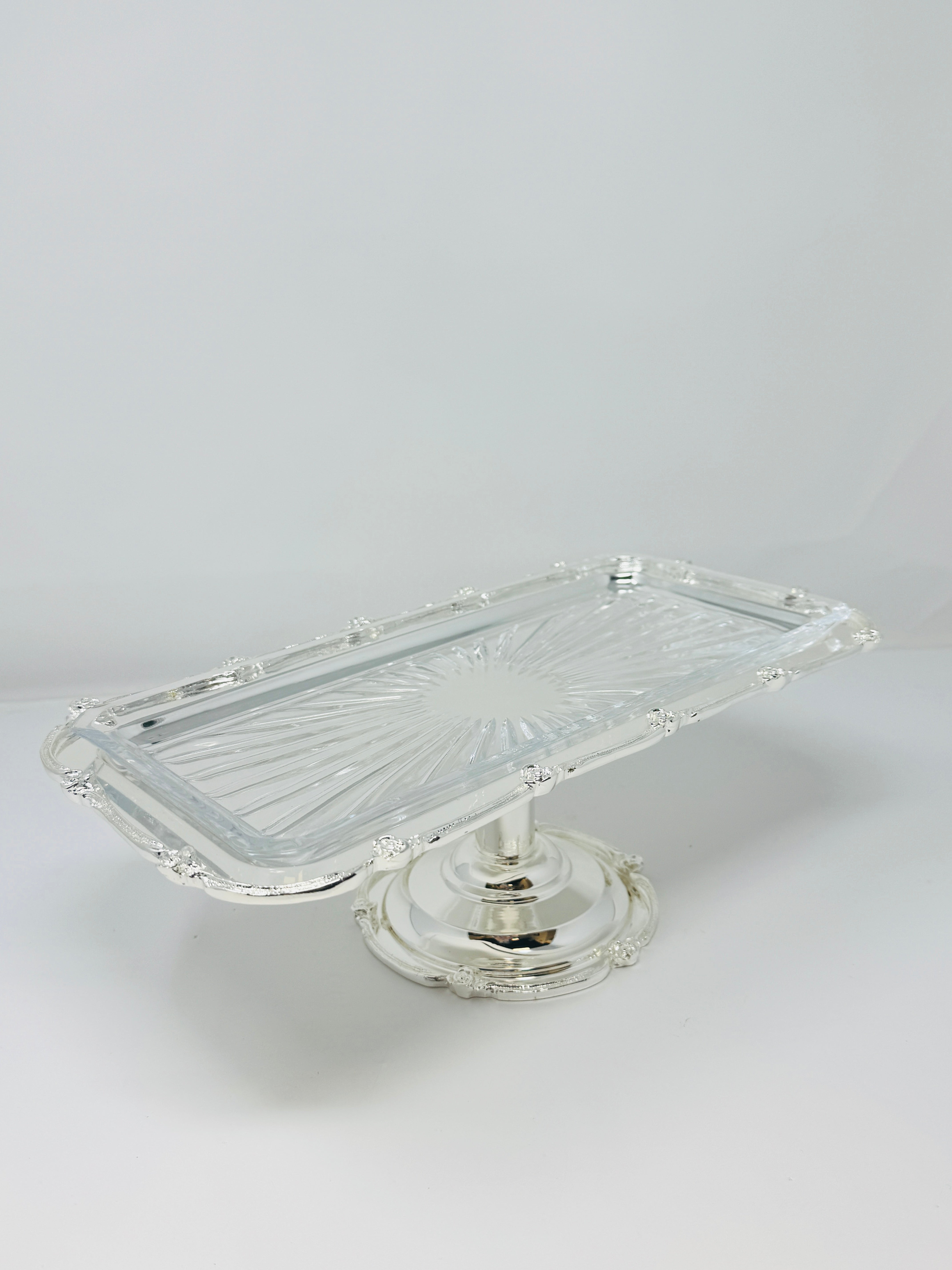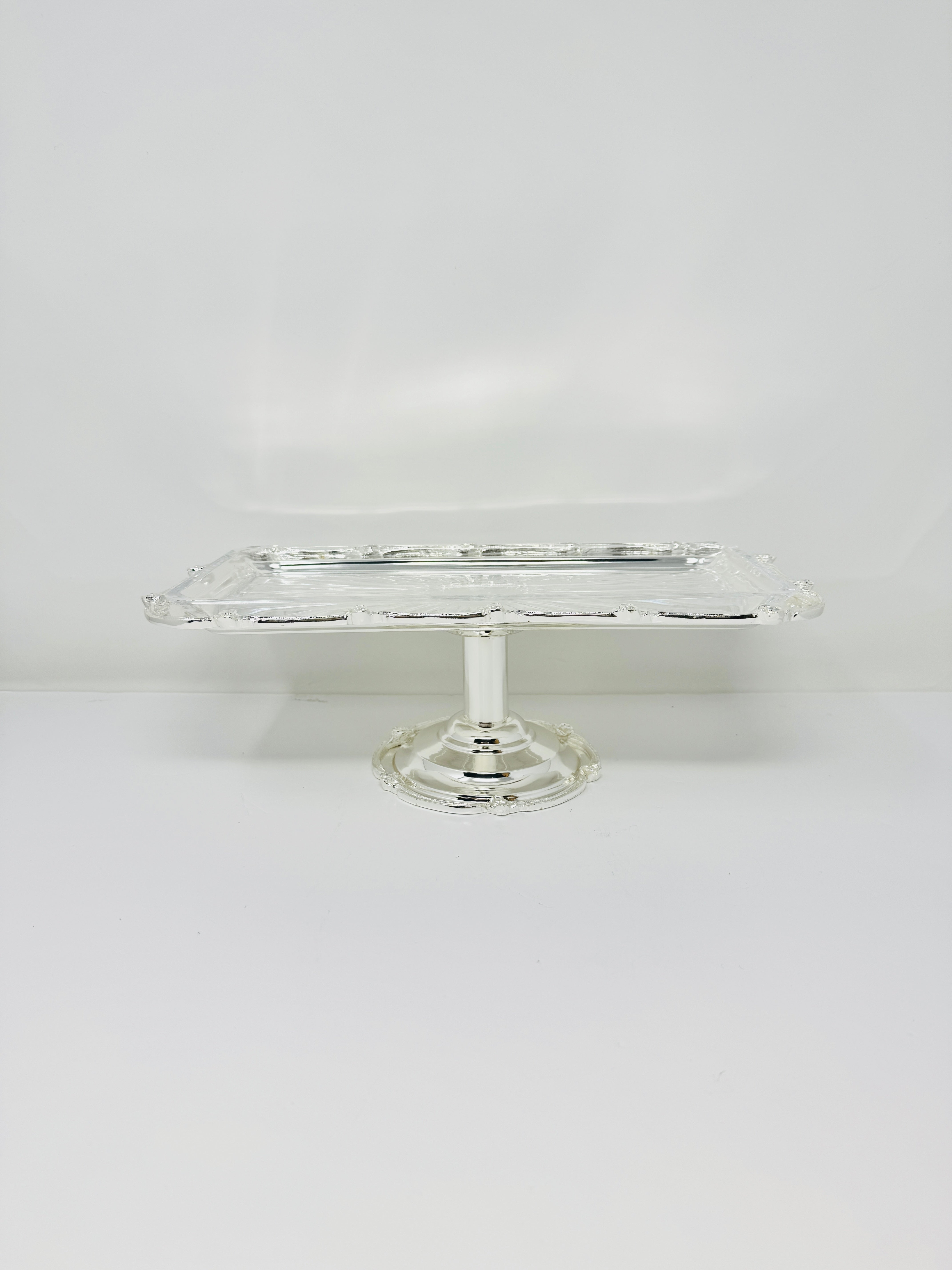 This beautiful Rectangular Serving Plate on Sliver Tone Stand is the perfect addition to any serveware collection. It can be used for serving pastries or food to guests. It can also be used as a decorative piece. Place a candle on top for an elegant look.