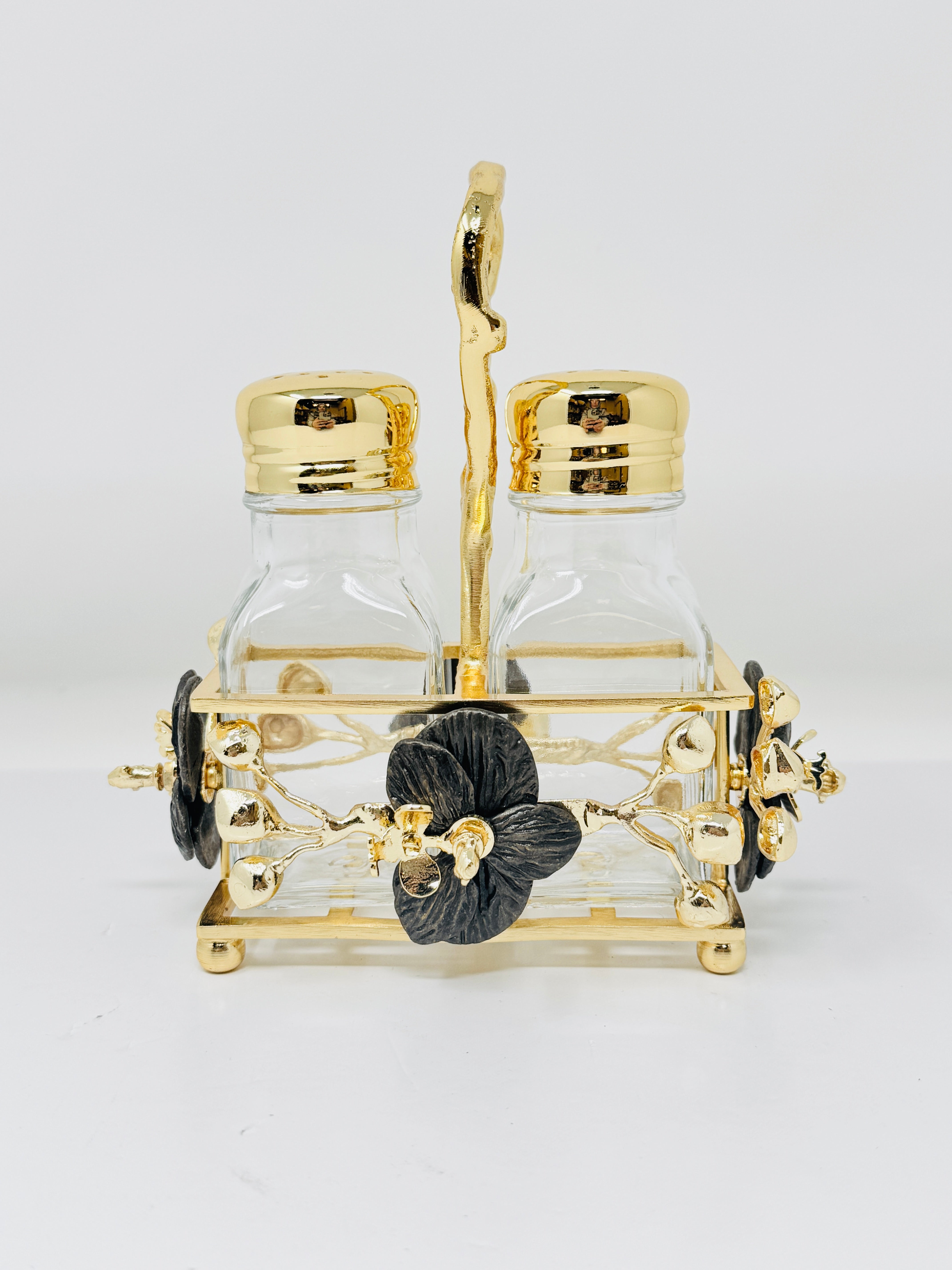 GOLDEN TONE SALT AND PEPPER SHAKER SET ON STAND, ORCHID COLLECTION