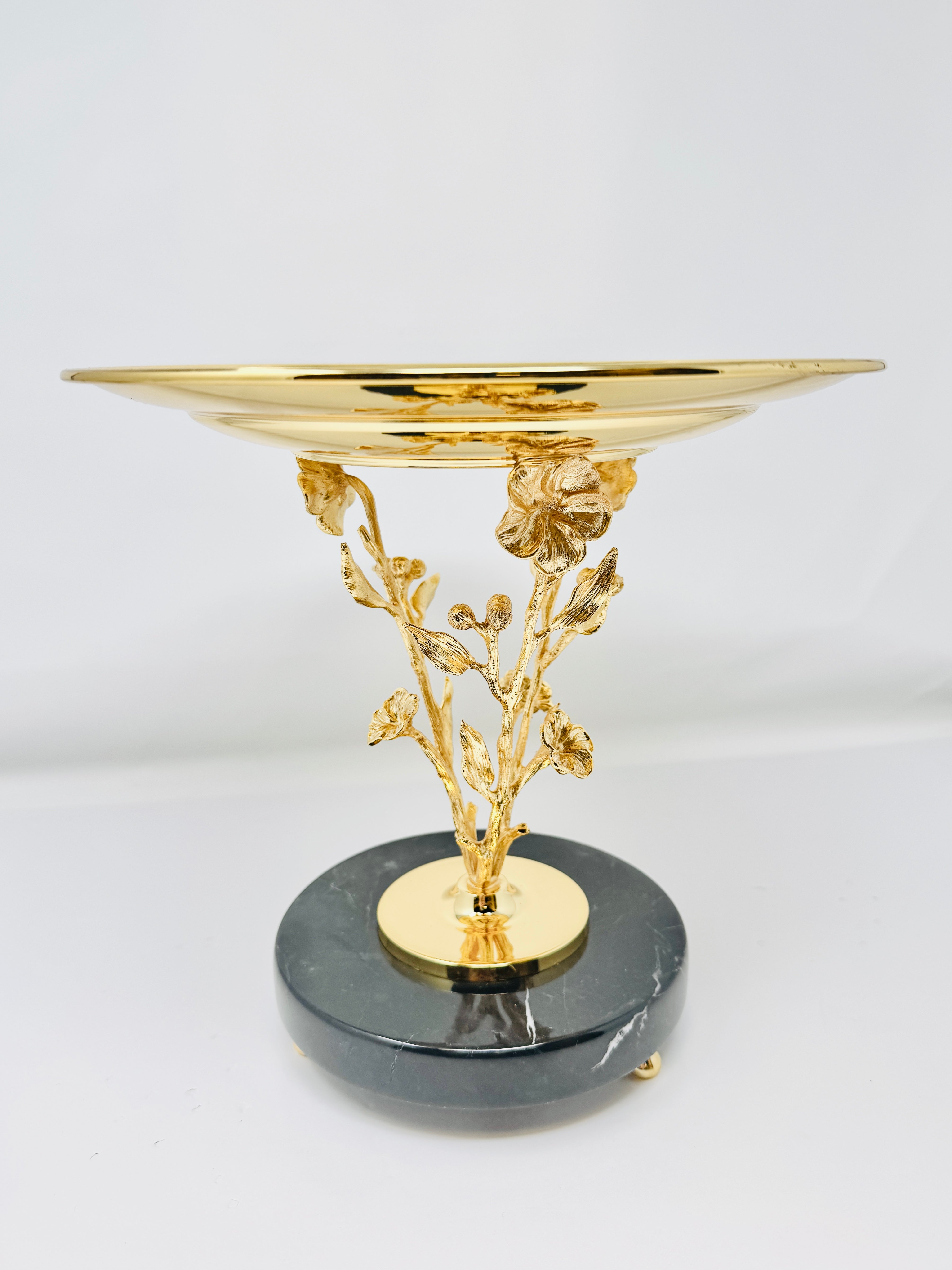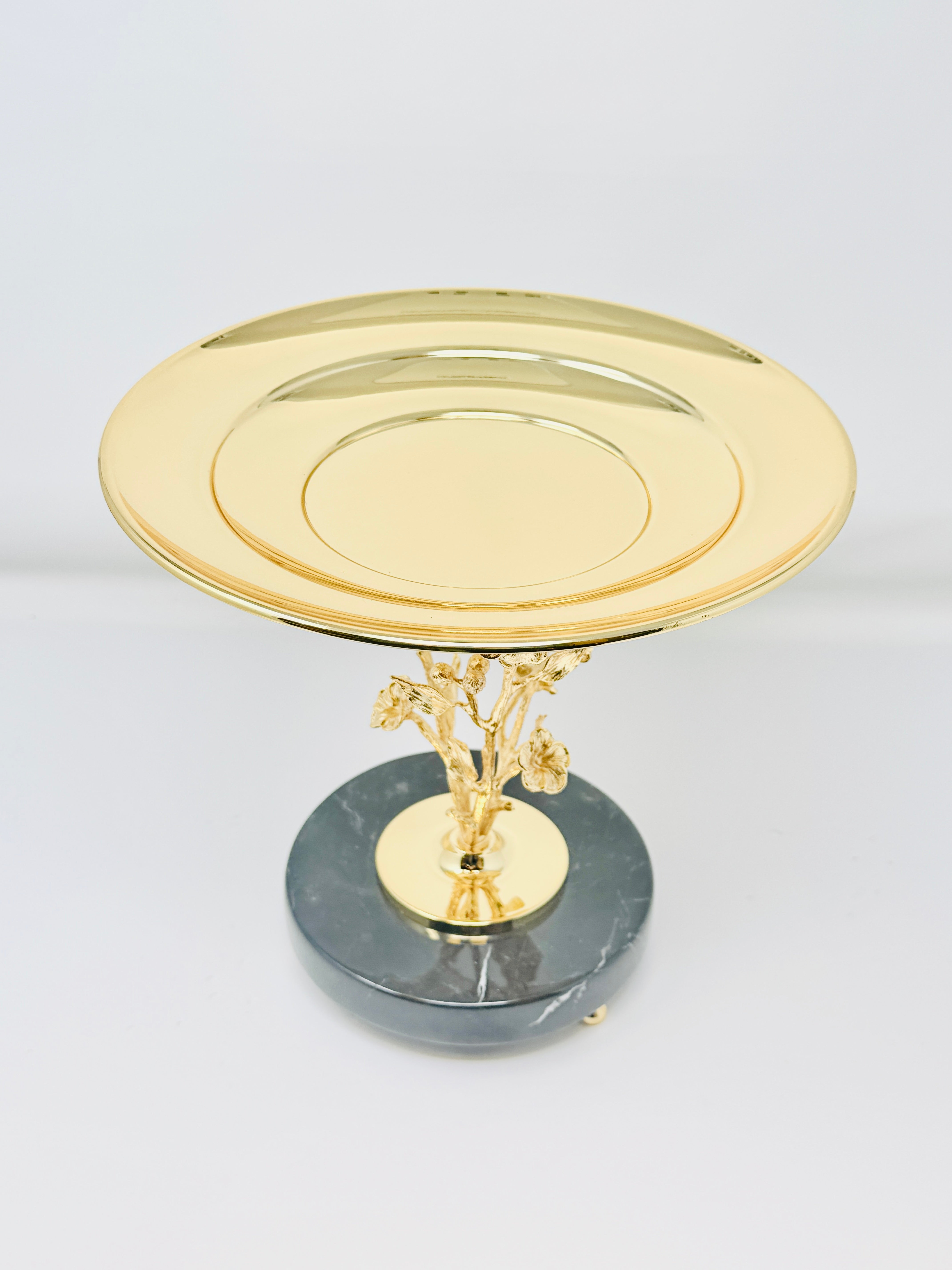 GOLDEN TONE CAKE STAND WITH ORCHID FLOWERS ON BLACK MARBLE STAND