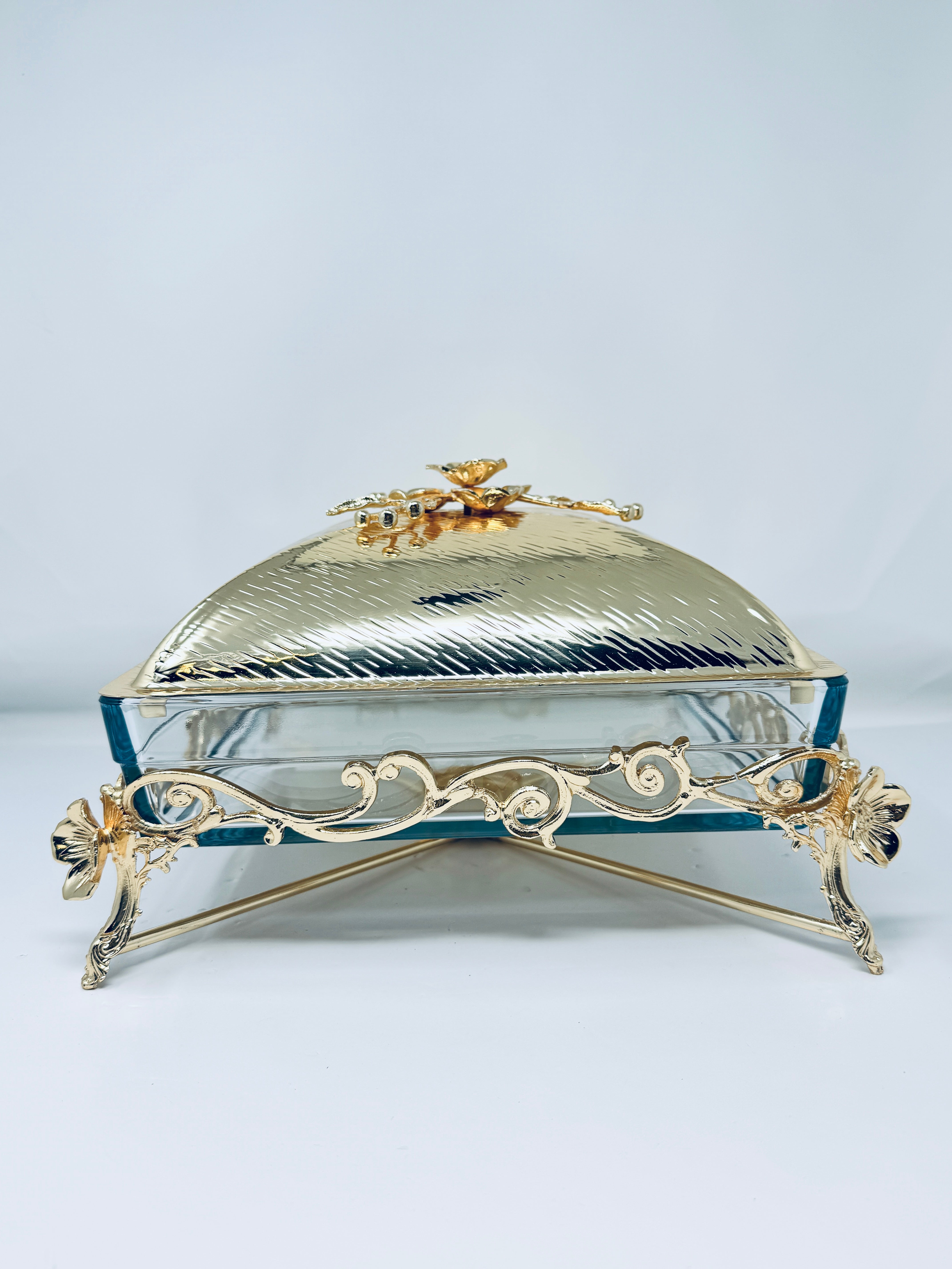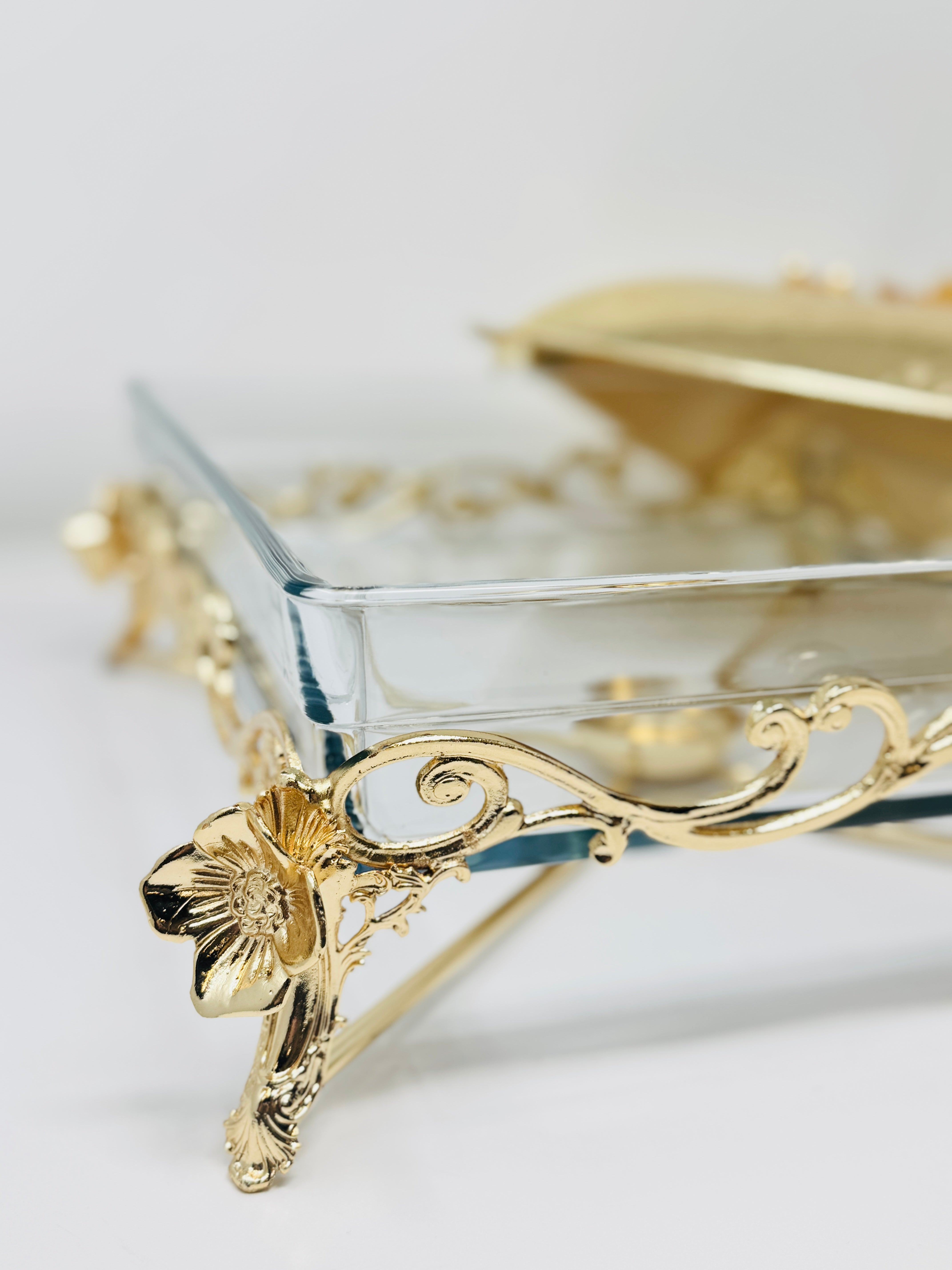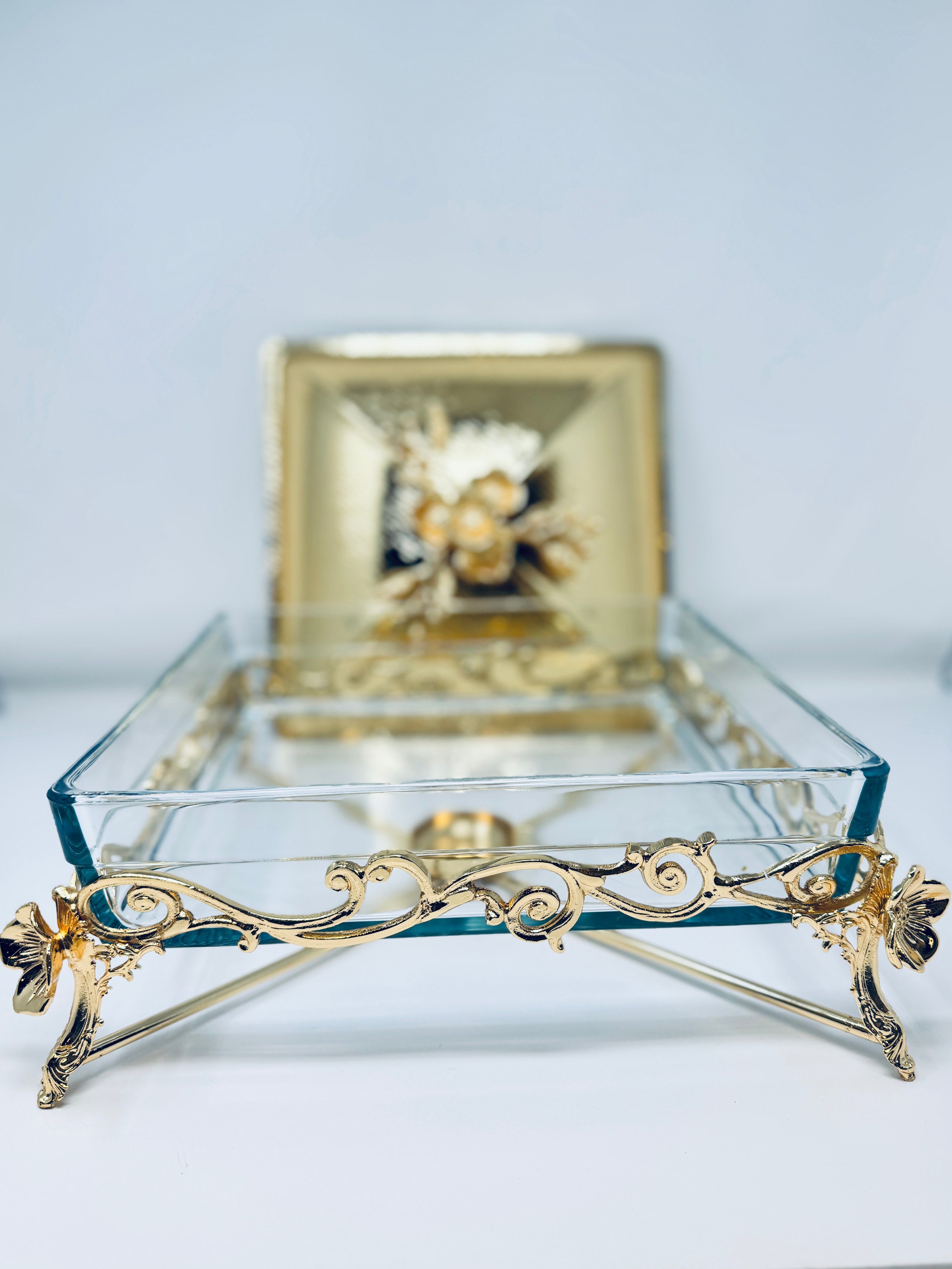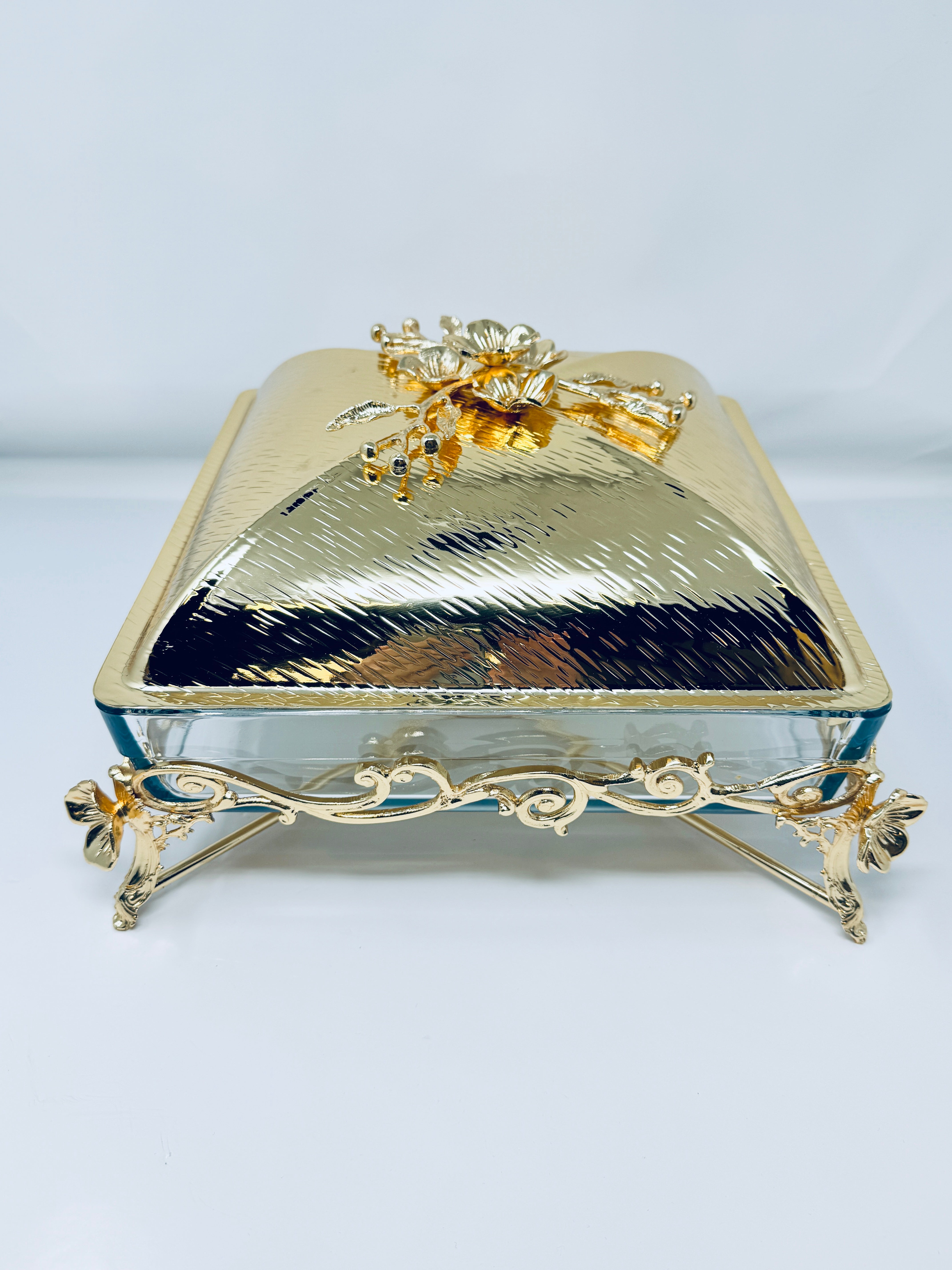 Add a beautiful piece to your serveware collection with this Pyrex Serving Dish sat upon a Gold Tone Stand. This item is extremely convenient as the glass dish is removable and can be placed directly into the oven. Convenience and class, a perfect combination for a successful dinner party.