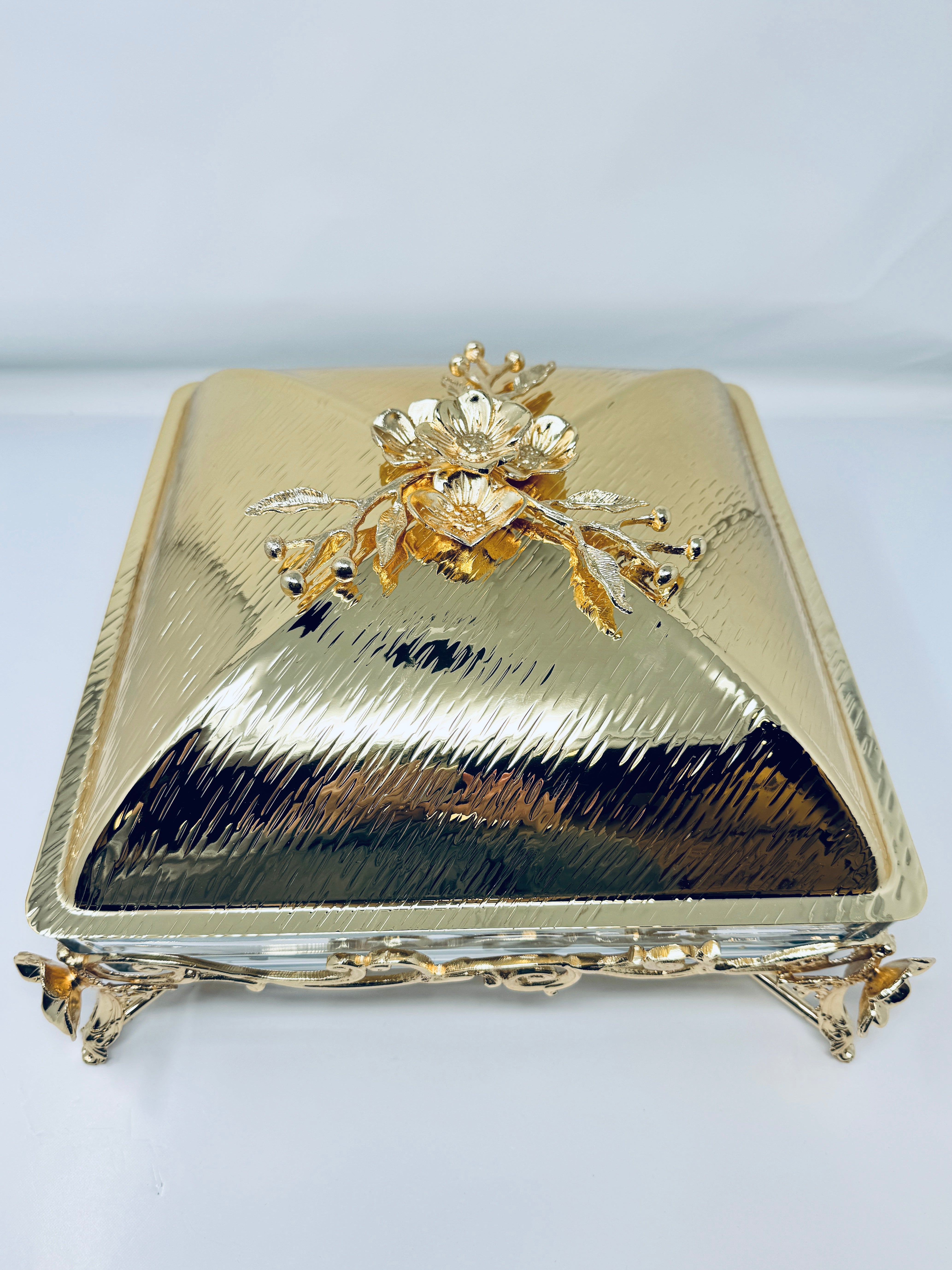 LARGE GOLD TONE SQUARE OVENWARE SERVING DISH, ORCHID FLOWER