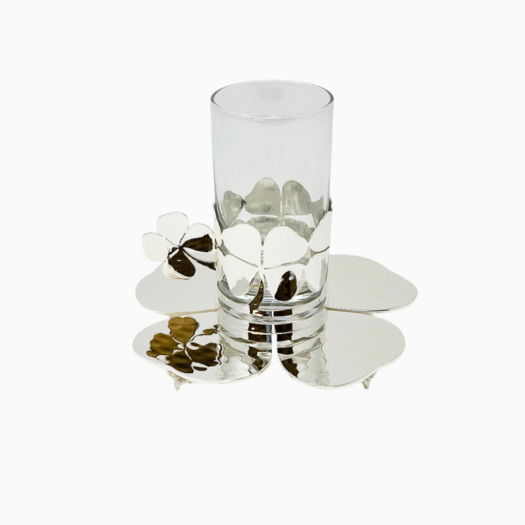 TEA CUP ON SILVER CLOVER SHAPED PLATE