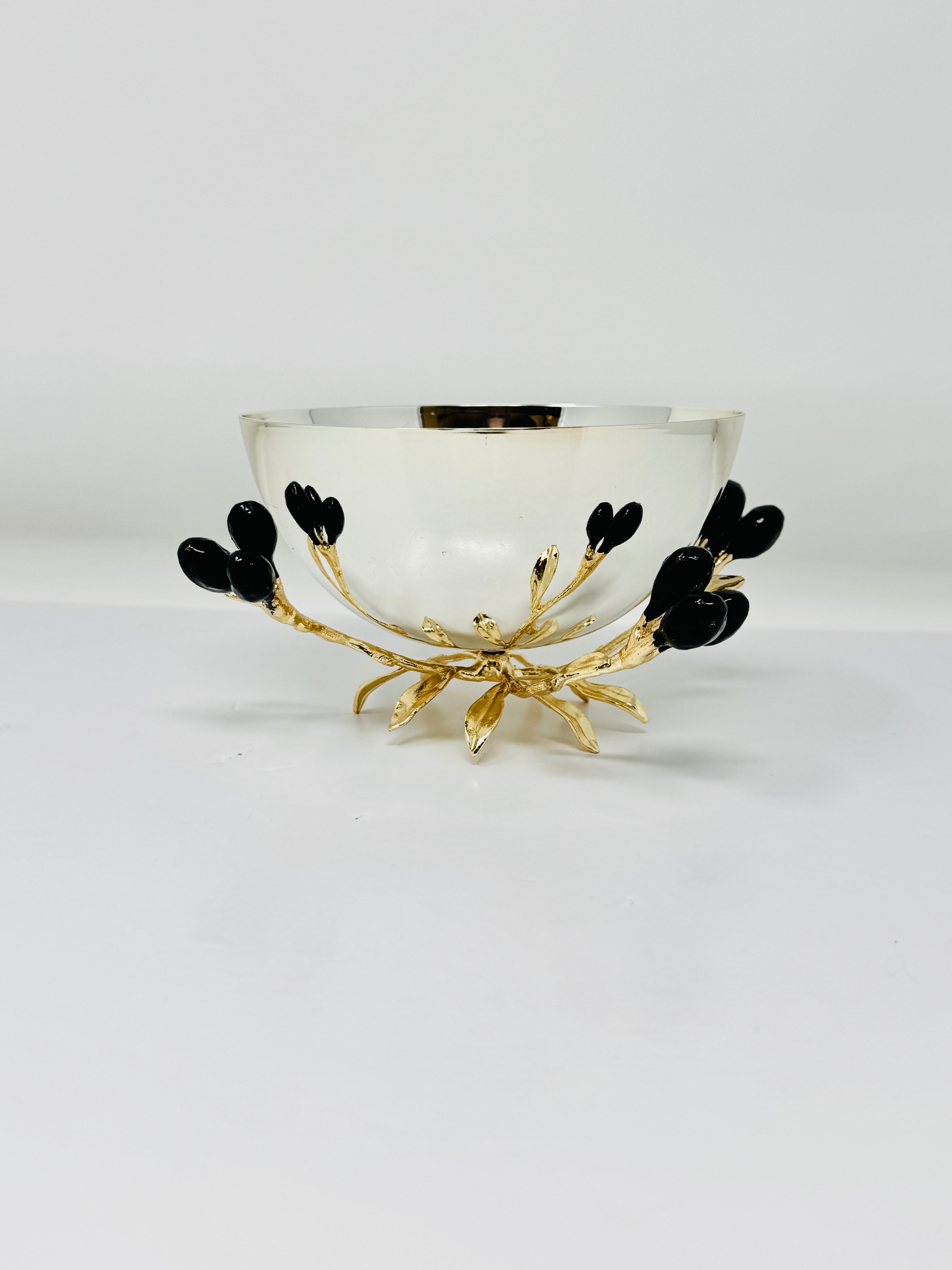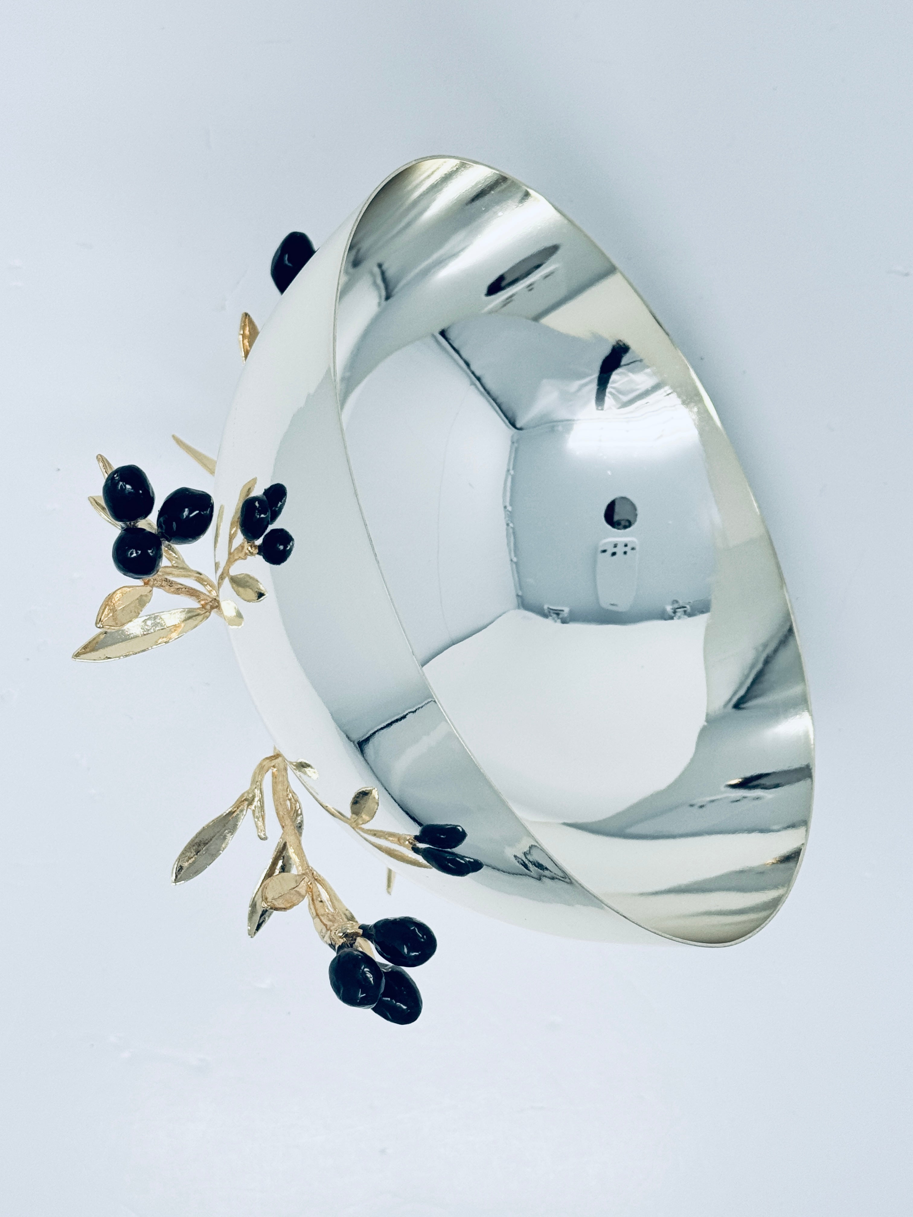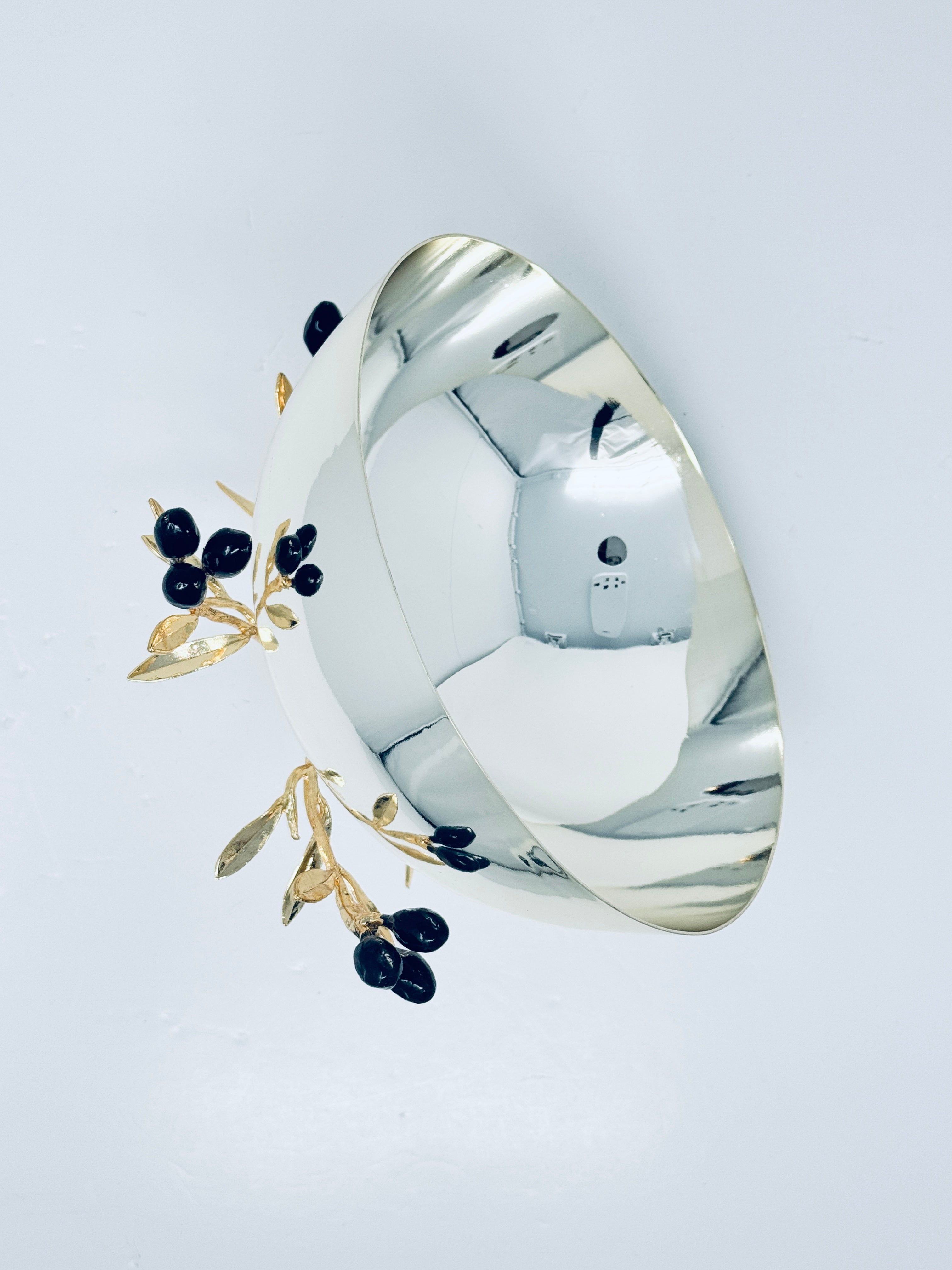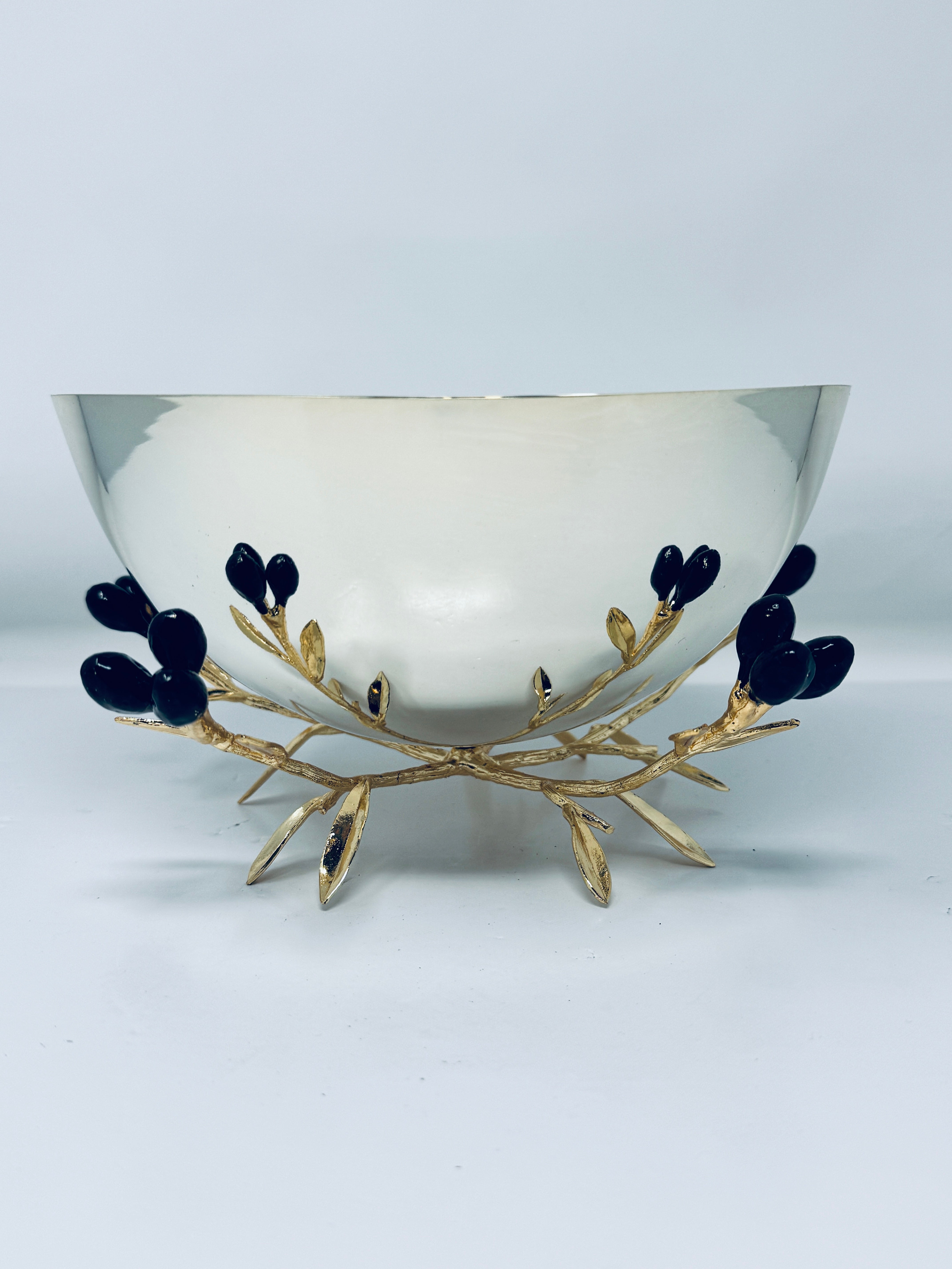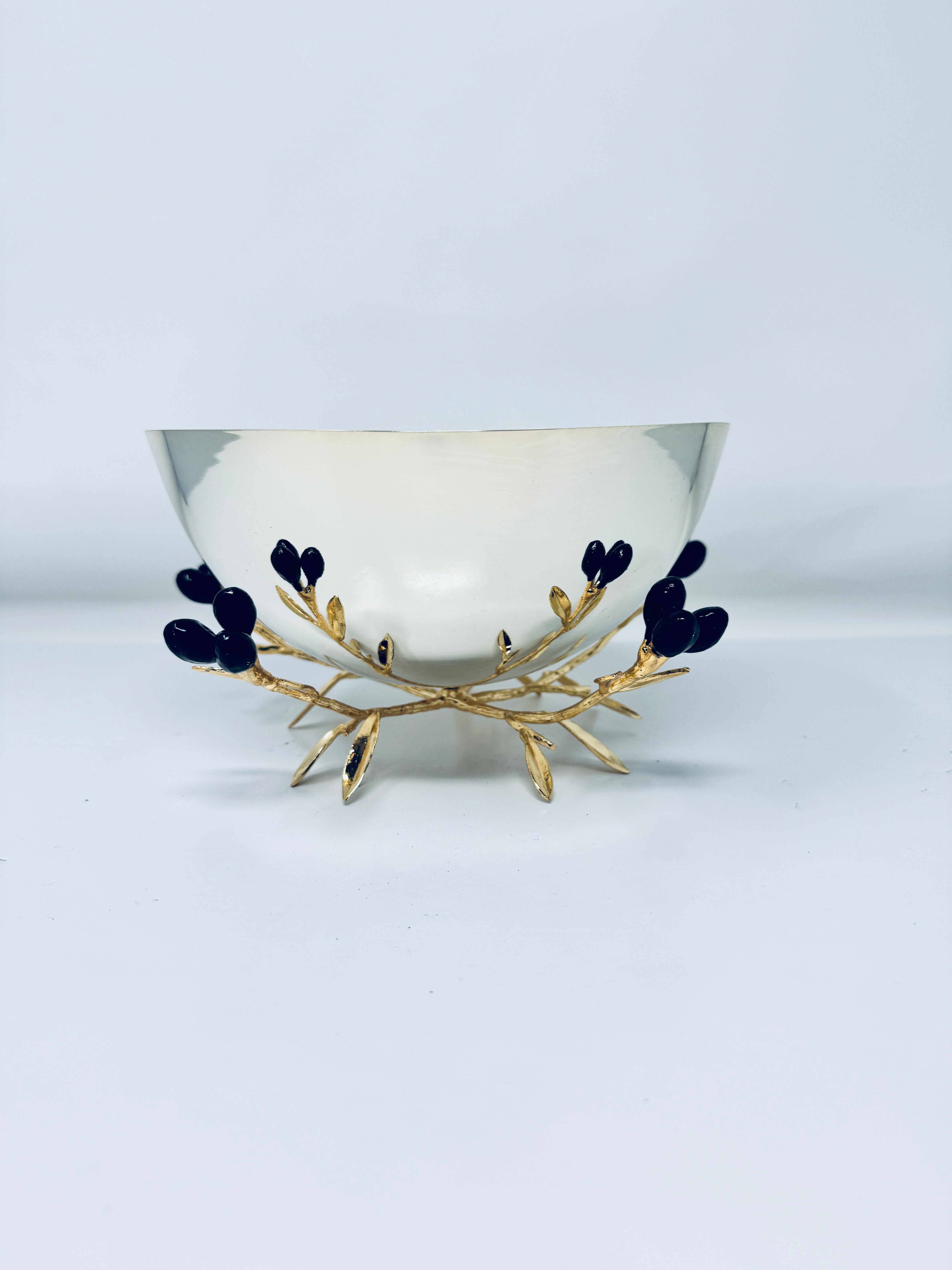 This Serving Bowl on olive leaf stand is a stunning piece that effortlessly blends classic elegance with modern design. Its intricate olive leaf accents and lustrous silver finish make it a captivating addition to any tabletop.