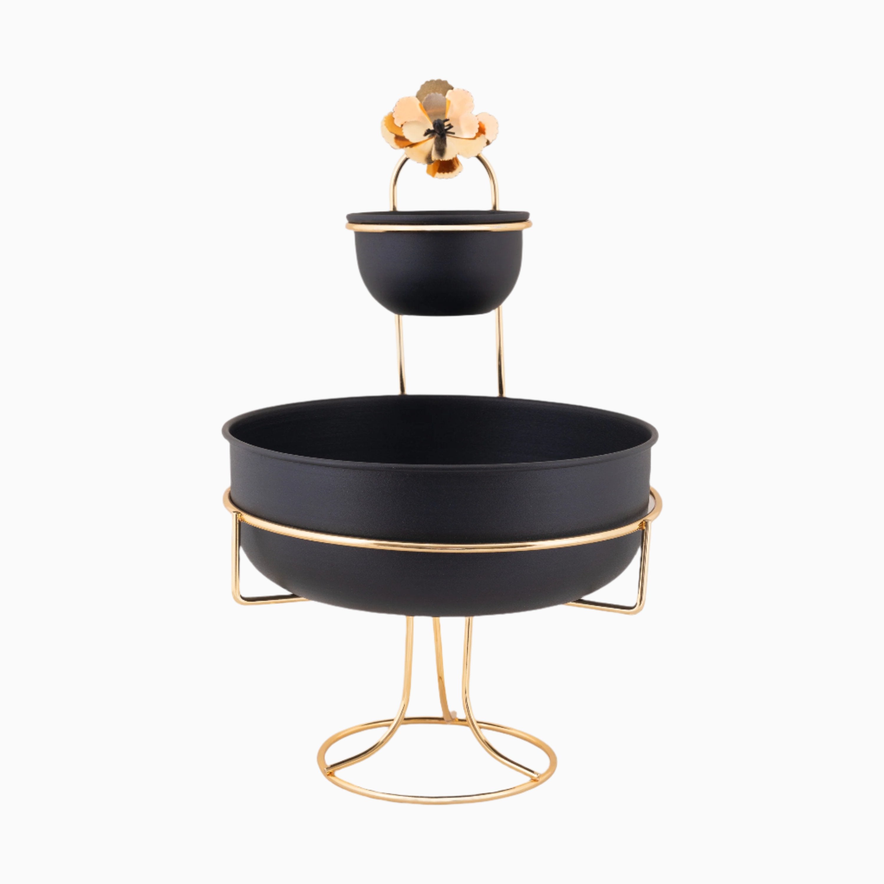 Serve in style with this two-tiered black and gold serving bowl set on a gold tone stand. A statement piece perfect for elegant gatherings, offering both beauty and function for snacks or desserts