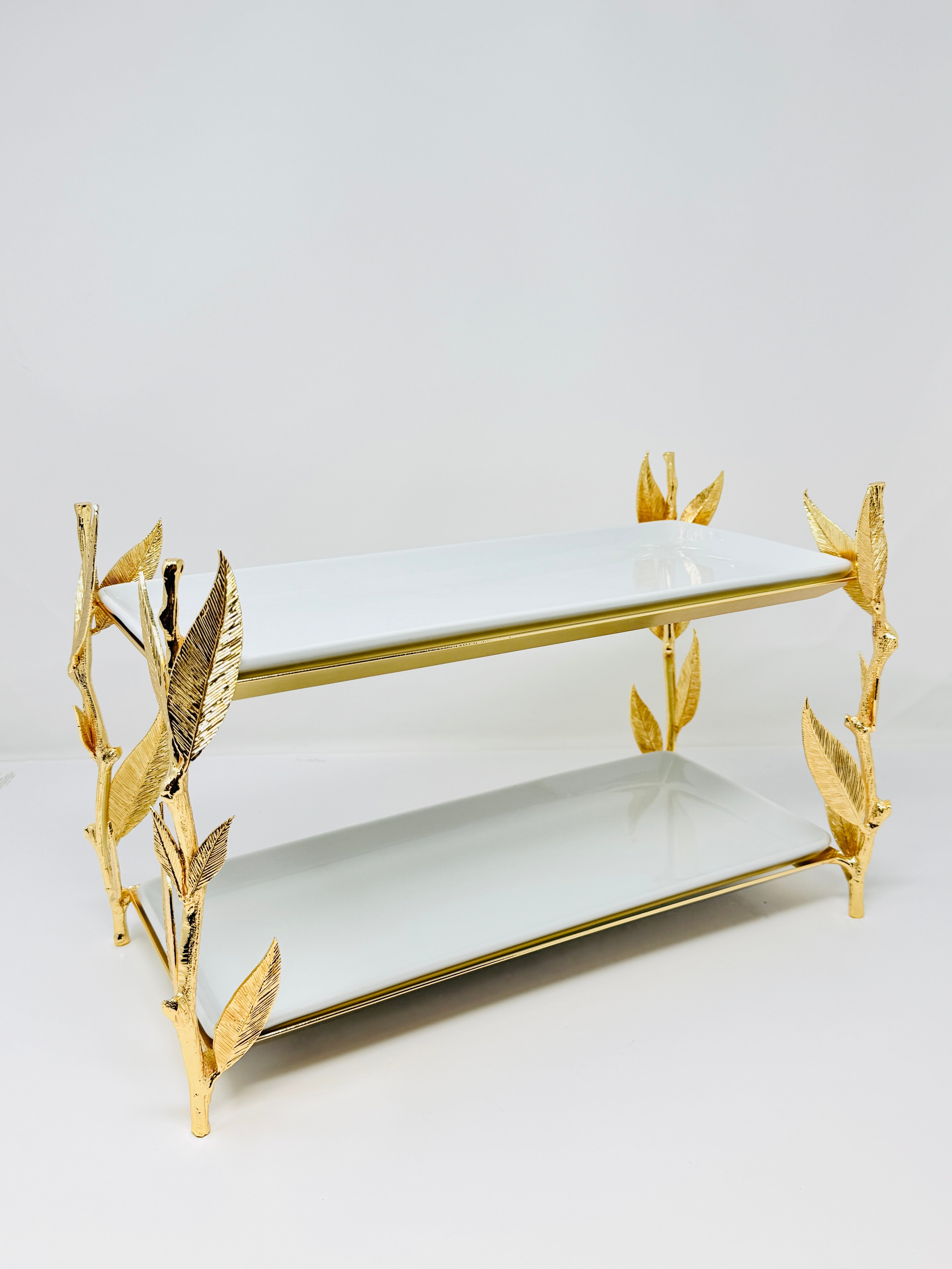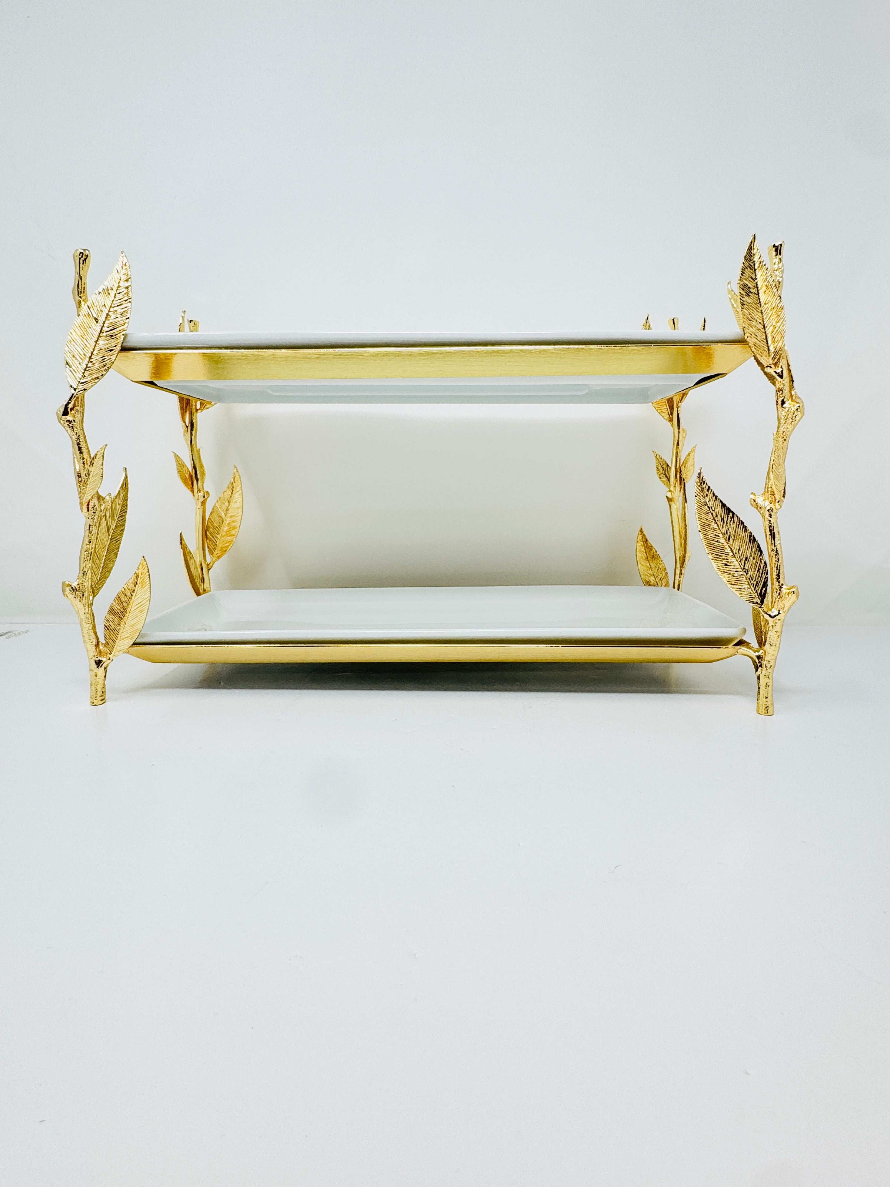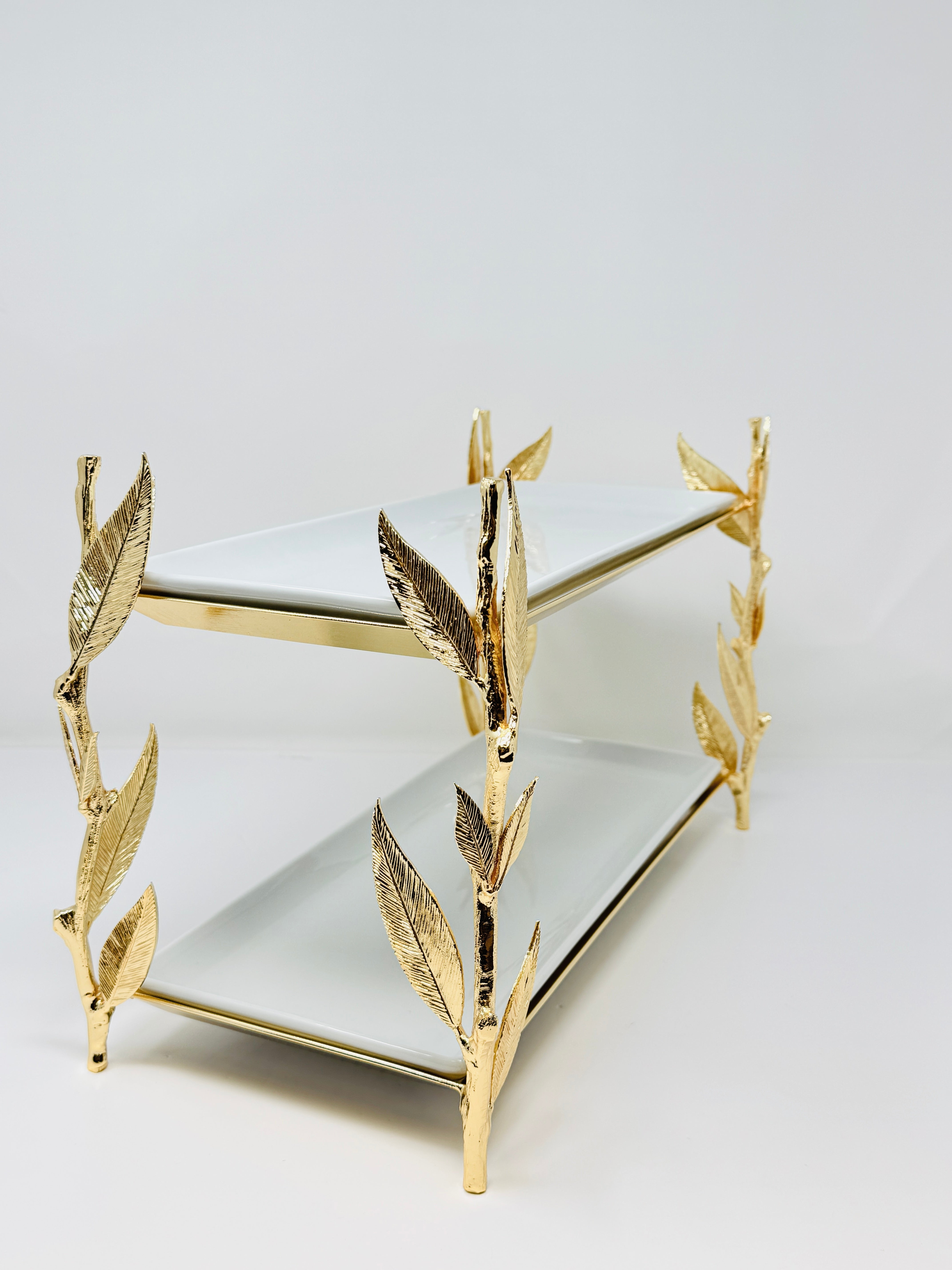 TWO TIER WHITE DESSERT PLATE ON GOLDEN TONE STAND, LEAF COLLECTION