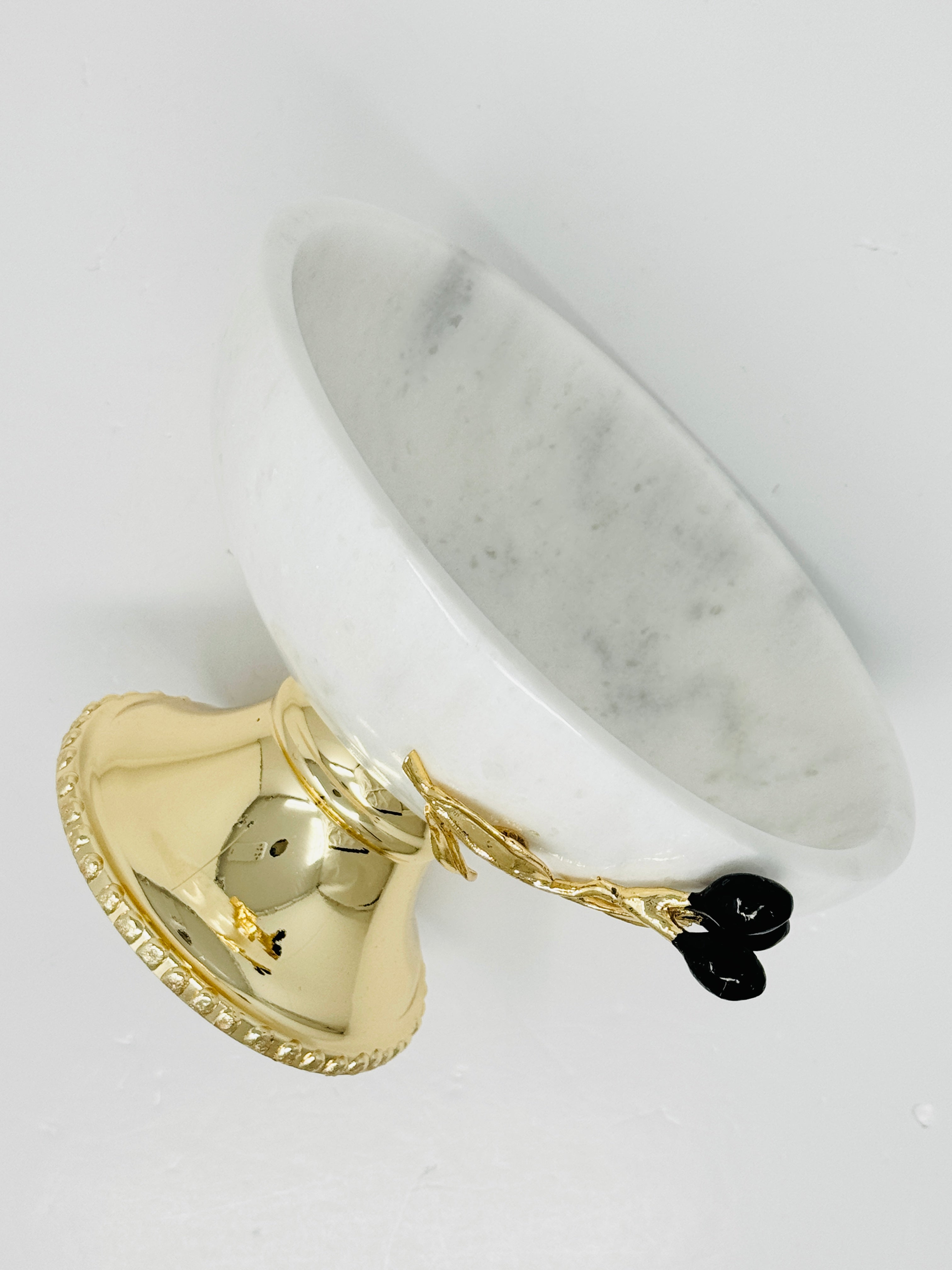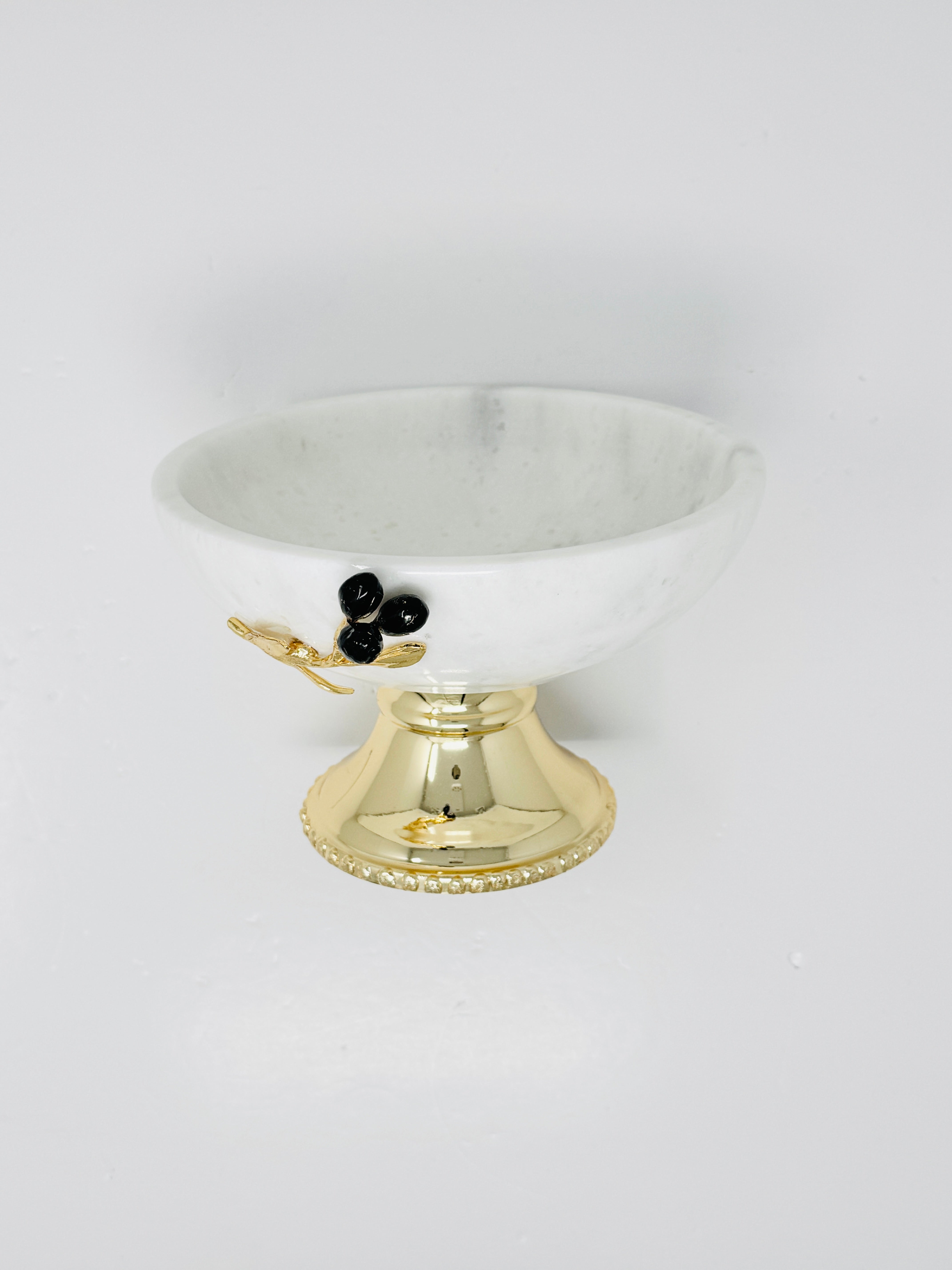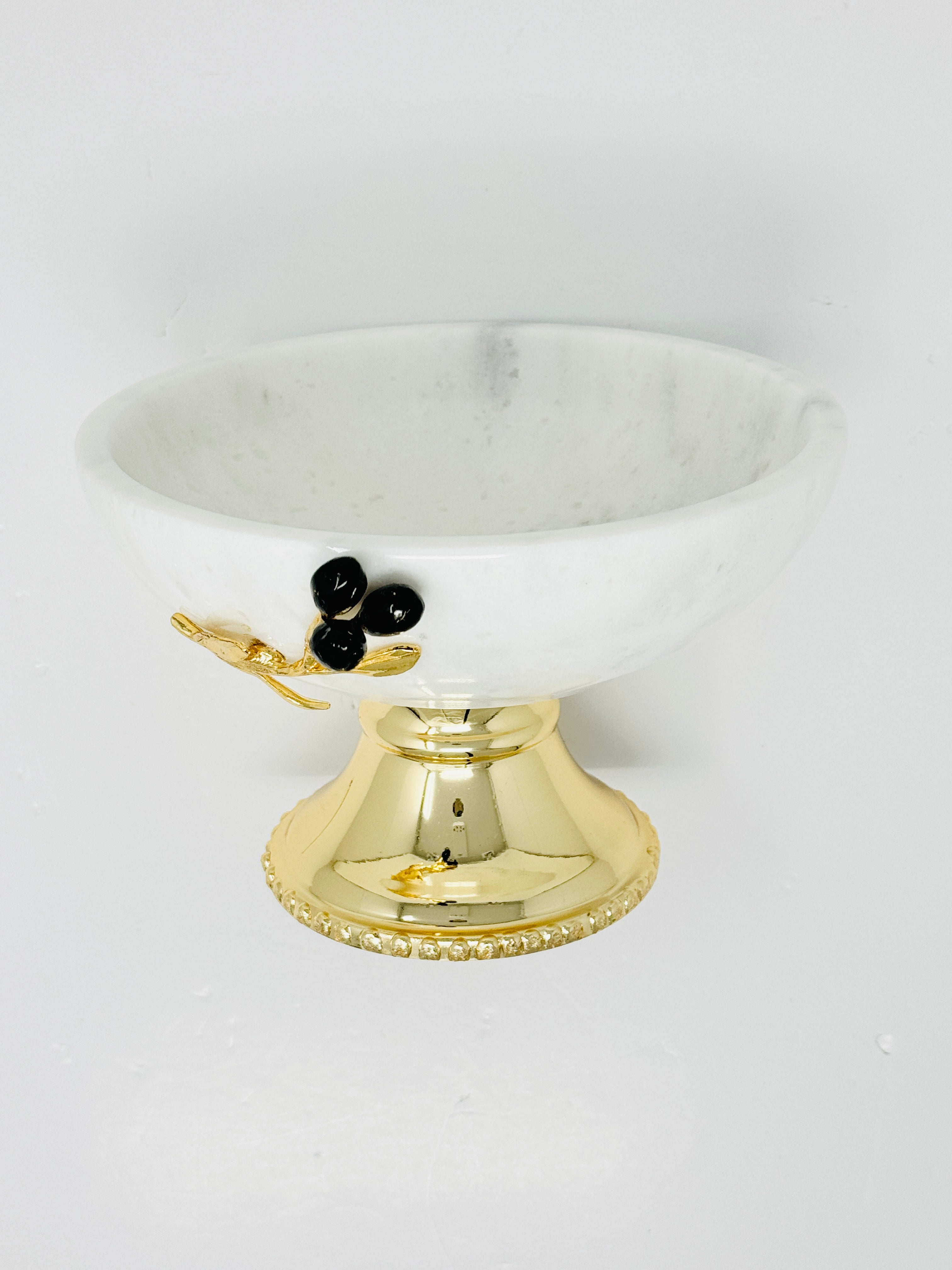 WHITE MARBLE SNACK BOWL ON GOLDEN TONE STAND, OLIVE COLLECTION