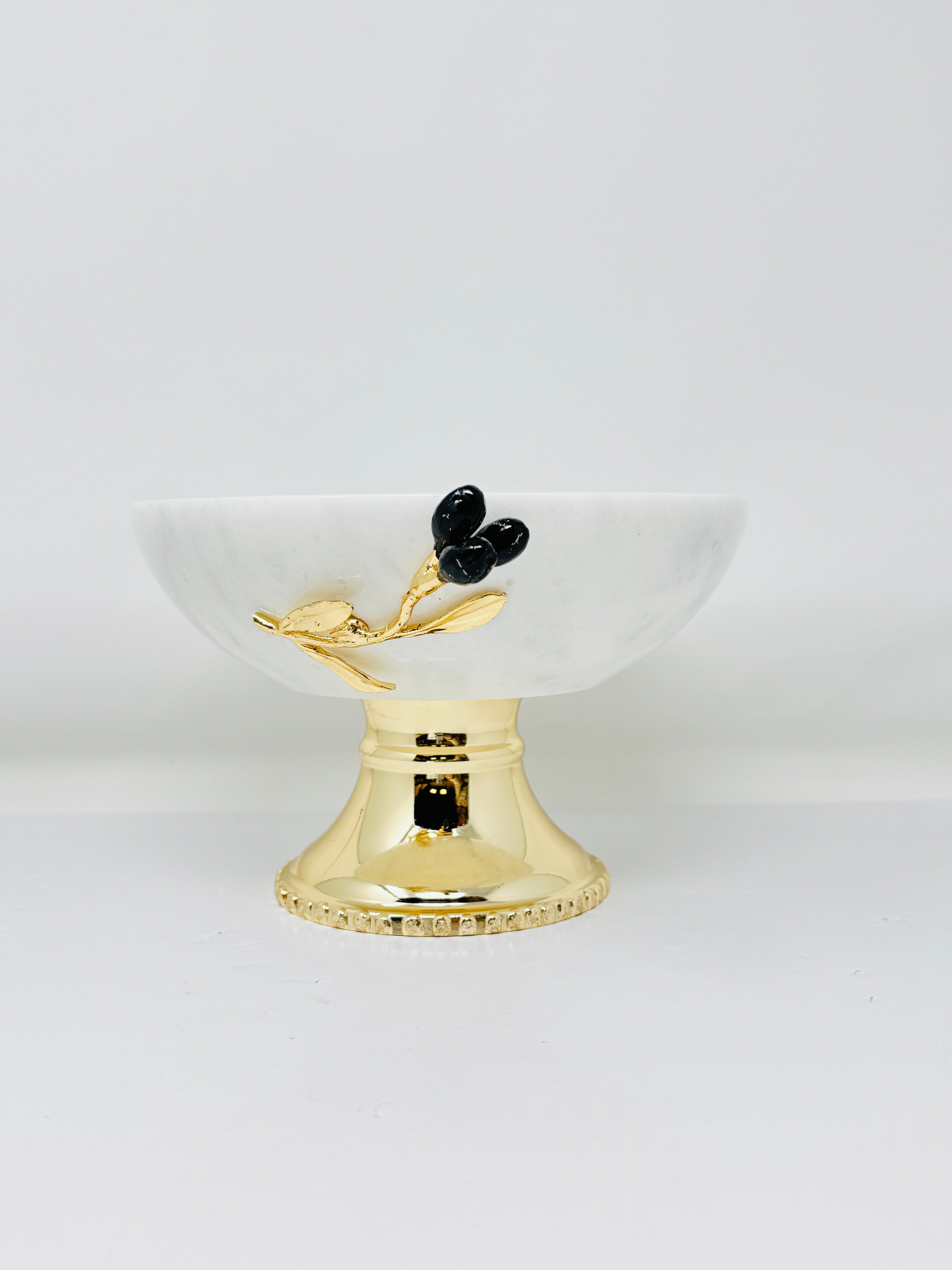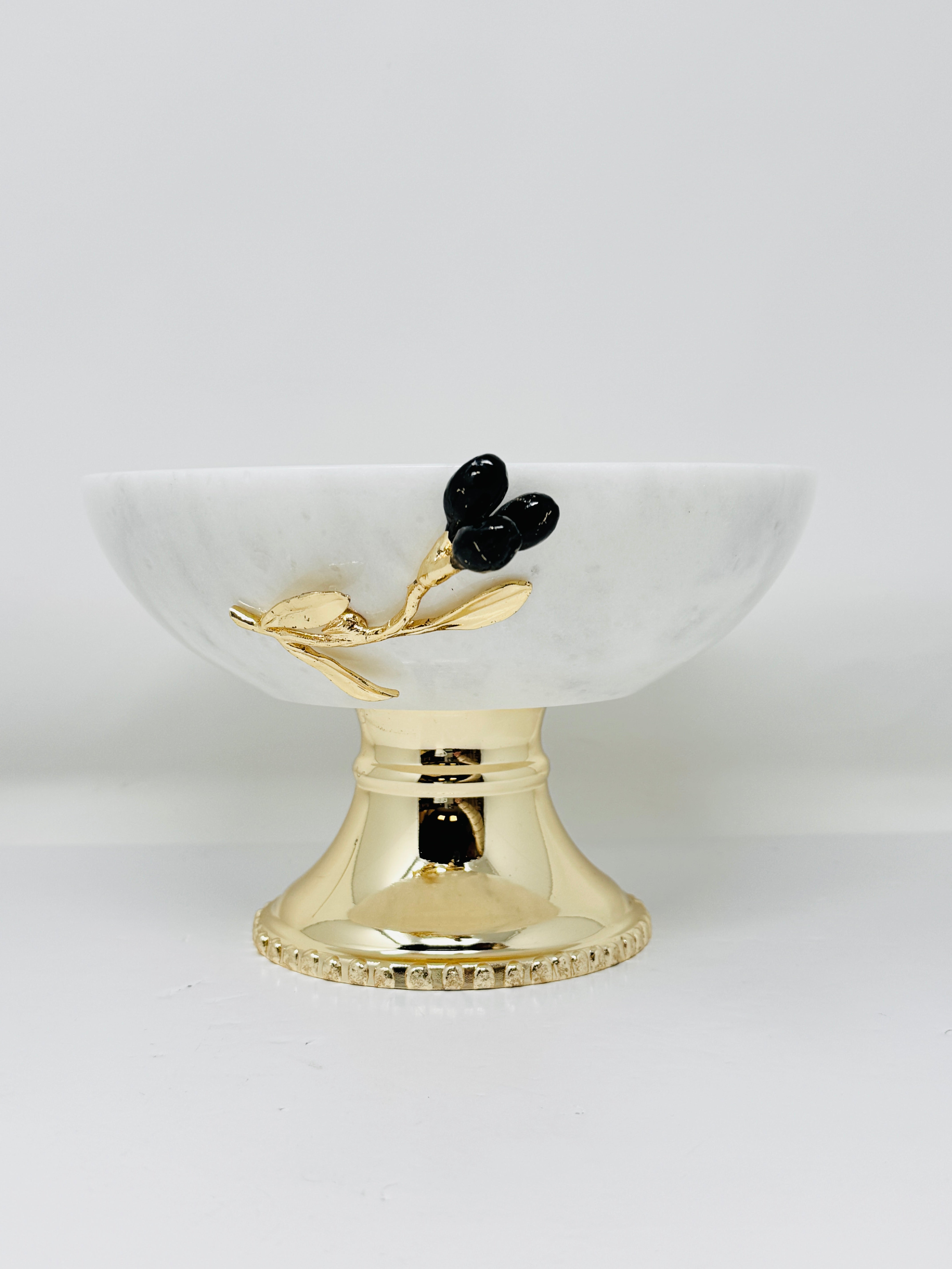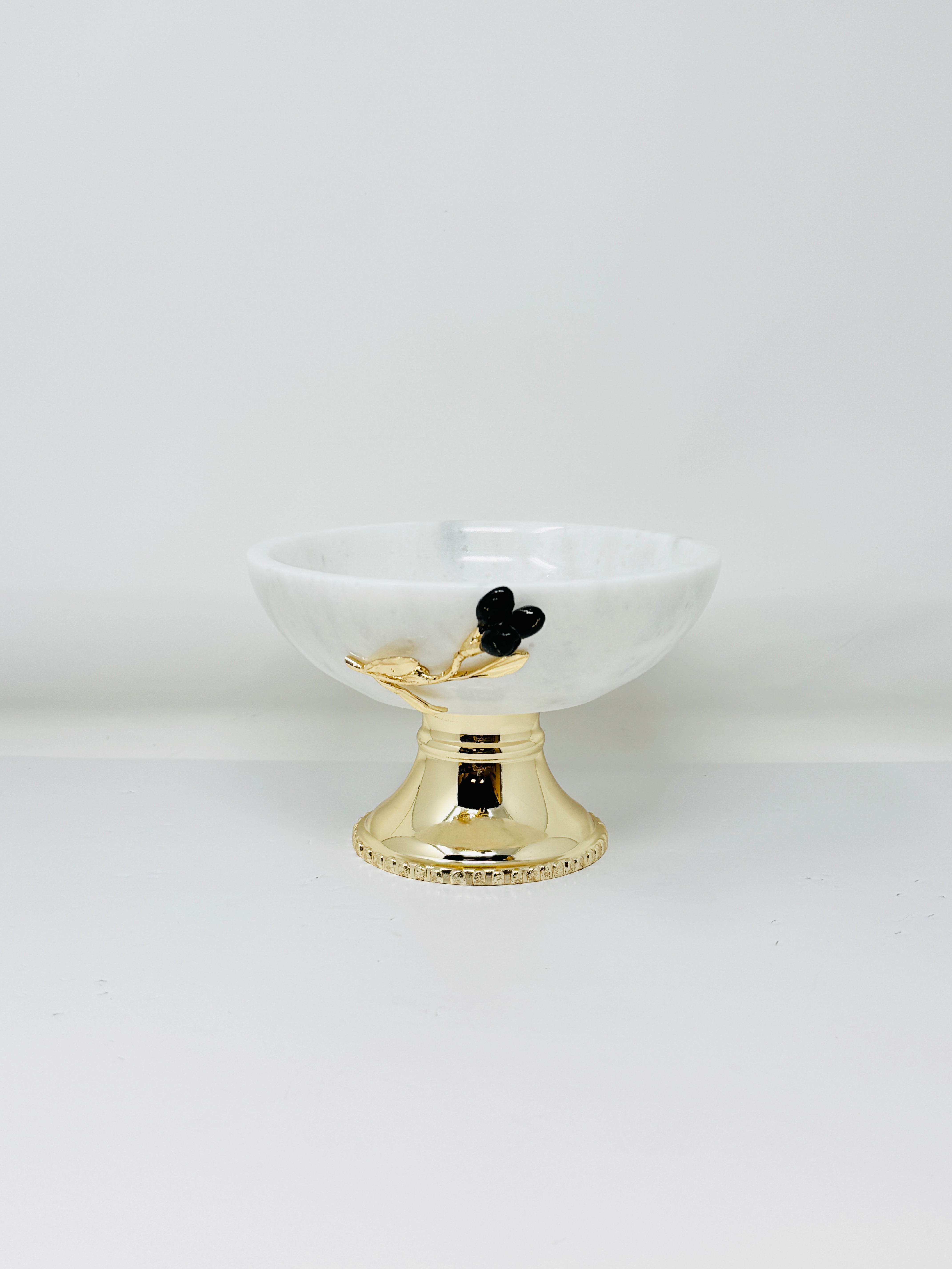 WHITE MARBLE SNACK BOWL ON GOLDEN TONE STAND, OLIVE COLLECTION
